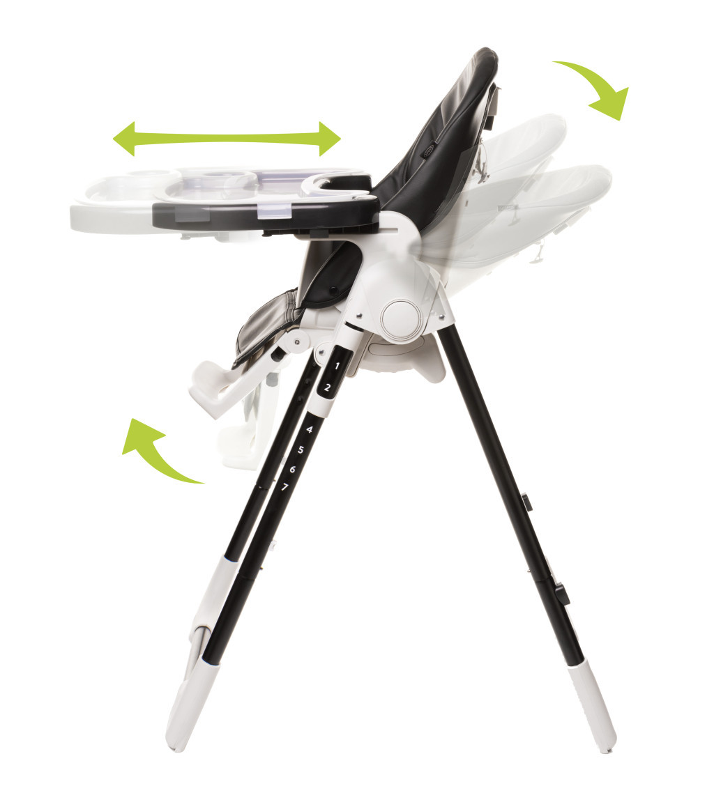A két tálcás rendszer rendkívül praktikus: az egyik tálca használható etetéshez, a másik pedig játékhoz vagy tartalék tiszta felületként. A tálcák 2 állásban állíthatók, így mindig megfelelő távolságba helyezhetők.