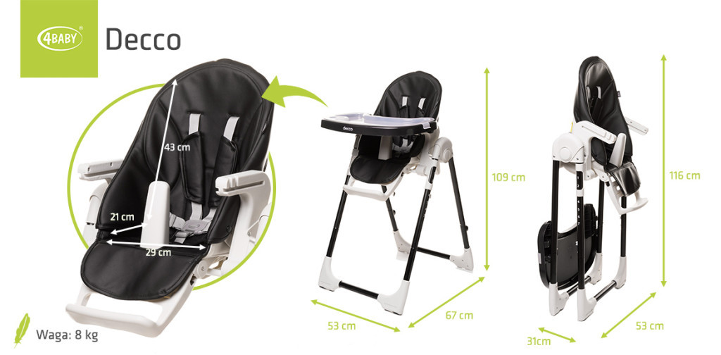 A 4Baby Decco etetőszék 6 hónapos kortól egészen 15 kg-os testsúlyig használható. Puha ECO bőr huzata és sokoldalú beállítási lehetőségei kényelmessé teszik a mindennapi etetést.