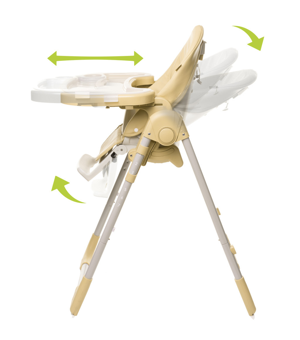 A két tálcás rendszer rendkívül praktikus: az egyik tálca használható etetéshez, a másik pedig játékhoz vagy tartalék tiszta felületként. A tálcák 2 állásban állíthatók, így mindig megfelelő távolságba helyezhetők.