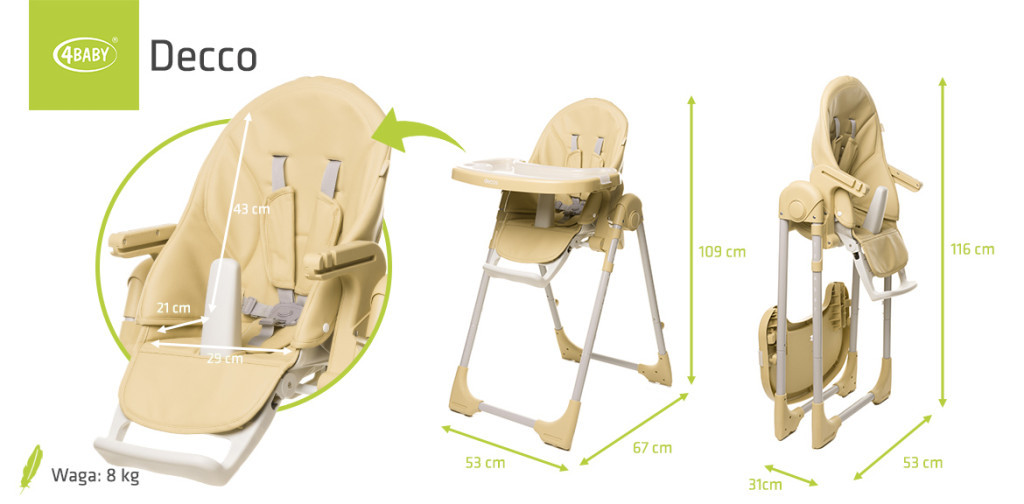 A 4Baby Decco etetőszék 6 hónapos kortól egészen 15 kg-os testsúlyig használható. Puha ECO bőr huzata és sokoldalú beállítási lehetőségei kényelmessé teszik a mindennapi etetést.