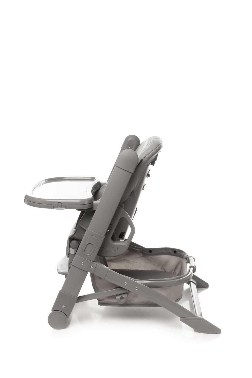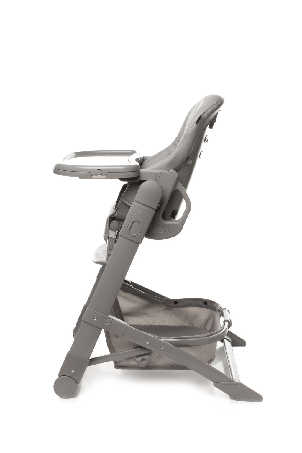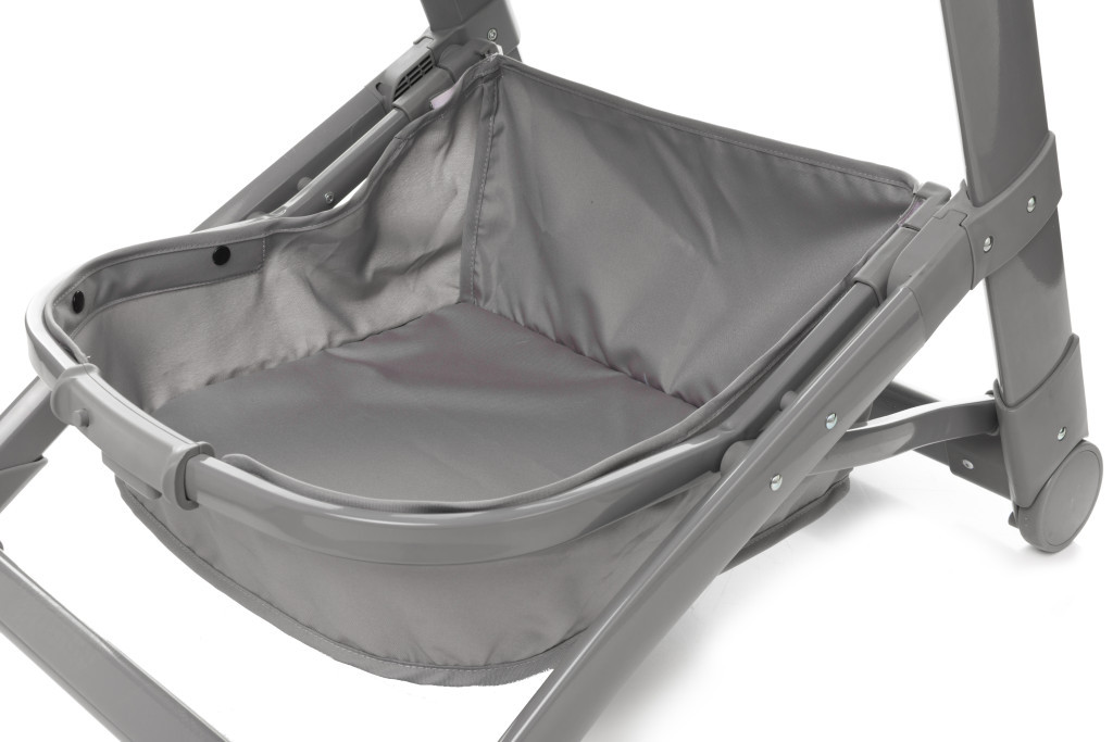 A levehető tálca két pozícióban használható, és könnyen tisztítható. A tartókosárban elegendő hely található az étkezéshez és játékok tárolásához.