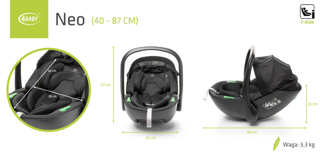 A Neo i-Size autósülés a modern biztonságtechnológiát és a kényelmes kialakítást ötvözi, hogy a gyermeked minden utazás során védve legyen. Megfelel a szigorú R129 (i-Size) szabványnak, és újszülött kortól egészen 40–87 cm-es testmagasságig ajánlott.