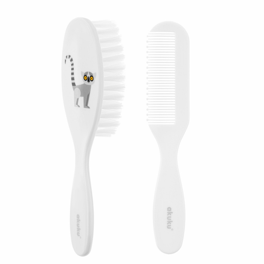 Akuku fésû és kefe Mûsörtékbõl készült biztonságos és finom kefe gyermekhaj fésüléséhez külön fésûvel készletben. A puha sörték ideálisak a finom babahaj ápolására. Antisztatikus tulajdonságaiknak köszönhetõen nem töltõdik fel sem a haj, sem az eszköz. A fésû lekerekített végekkel rendelkezik, amely védi a baba finom bõrét.méretek:kefe: 15 × 4 × 2,5 cmfésû: 15 × 3 × 0,5 cm