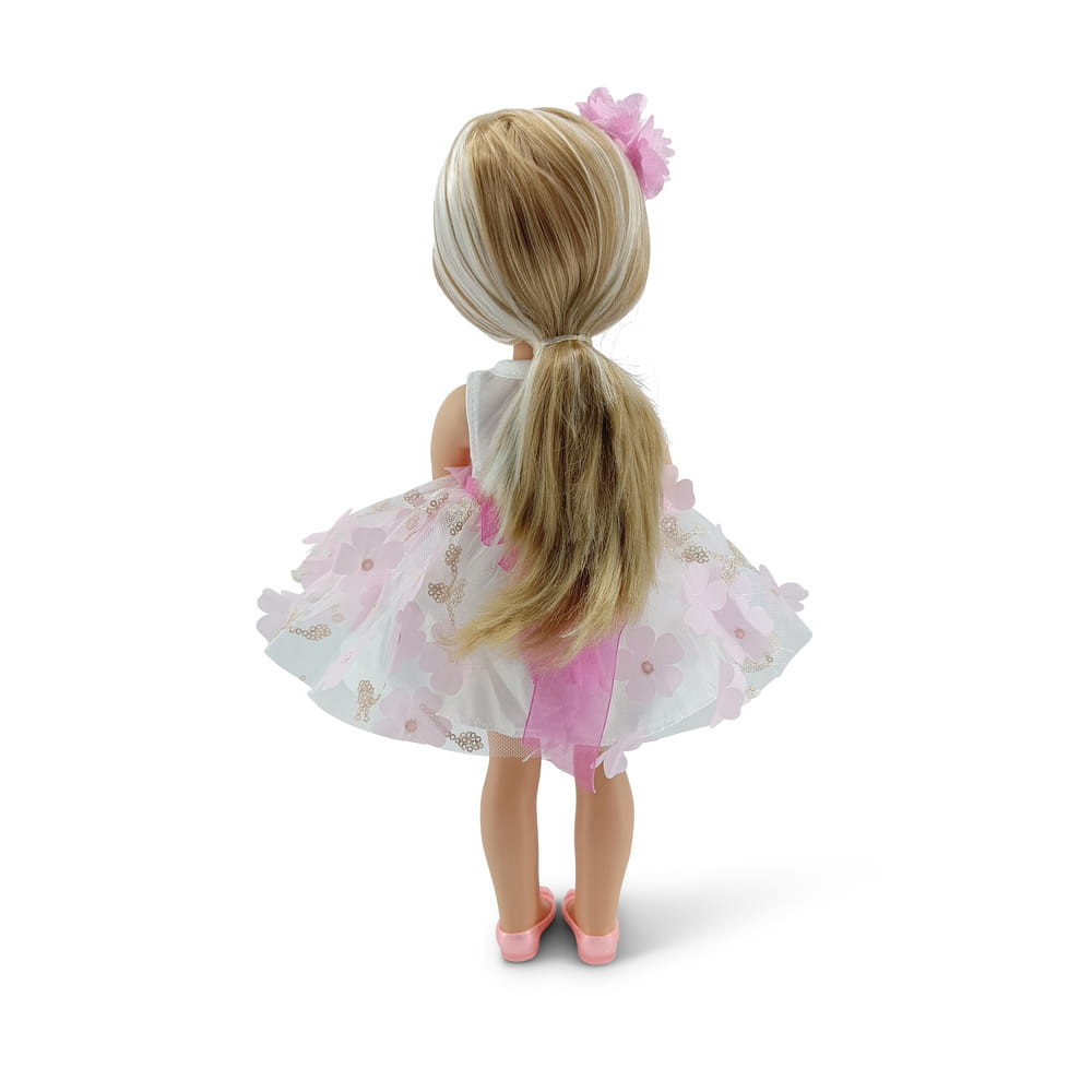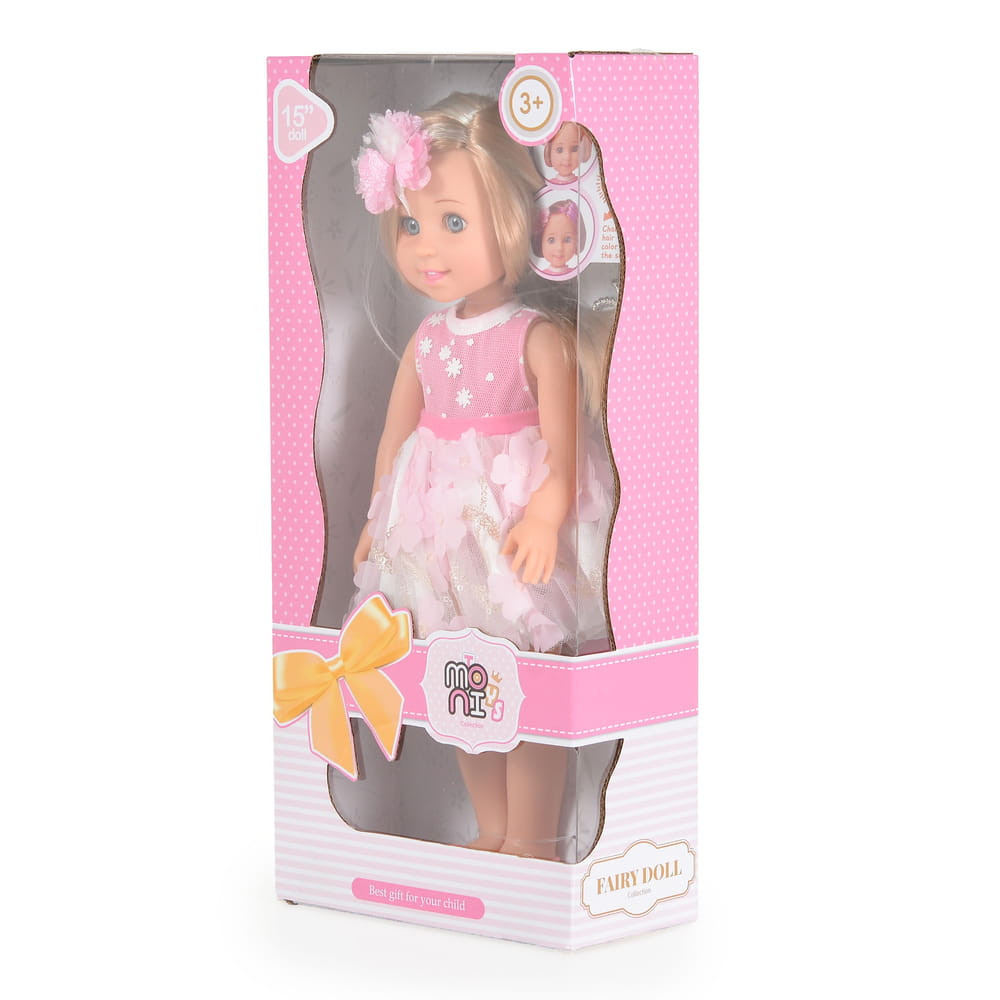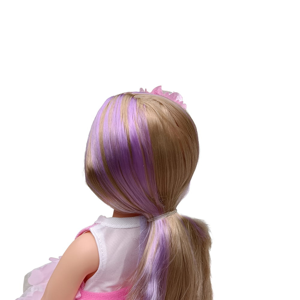 Tündérbaba 38 cm-es méret, hosszú hajjal, amely a napfényben megváltoztatja a színét.