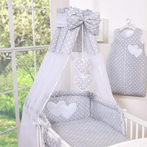 BabyLion Prémium baldachin függöny - Szürke - Fehér pöttyök - szívecskével