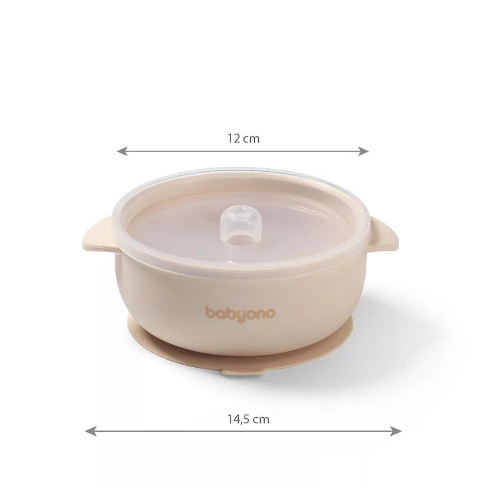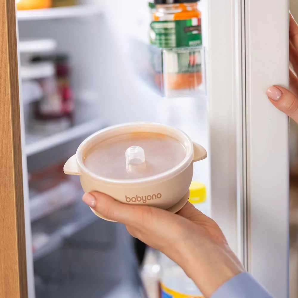 Új ízeket szeretnél bevezetni a baba étrendjébe? A Babyono szilikon tapadókorongos, fedeles tálkája segít a szilárd ételek bevezetésében a baba étrendjébe, és abban, hogy a kicsi megtanuljon önállóan enni. Használhatod levesek, tészták, zöldségek, gyümölcsök és joghurtok felszolgálására.Az erõs tapadókorongnak köszönhetõen a szilikon bébitál a helyén marad, még akkor is, ha a felfedezõkedvû baba el akarja dobni. A lekerekített széleknek köszönhetõen a baba önállóan is fel tudja szedni az ételt. A fedél viszont felelõs az étel frissen és melegen tartásáért, míg a csúszásgátló fogantyúk lehetõvé teszik a tál biztonságos mozgatását.A tapadókorongos BabyOno baba tál biztonságos, BPA-mentes és tartós szilikonból készült. Mikrohullámú sütõben és mosogatógépben is használható.Tökéletes elsõ bébitál, amelyet szilárd ételek bevezetésére használhatsz. Használható levesek, zabkása, joghurt, rizs, tészta, gyümölcsök és zöldségek felszolgálására. Arra ösztönzi a babát, hogy új ízeket fedezzen fel.Egy nagy tapadókorong tartja a tálat az eredeti helyén, még akkor is, ha a baba mozgatni vagy dobálni akarja. A kicsi az evésre koncentrálhat, és a szülõk elkerülhetik a rendetlenséget.A lekerekített éleknek és a magasabb falaknak köszönhetõen könnyebb ebbõl felszedni az ételt akár kézzel akár evõeszközzel. A baba örömmel fog enni, és közben fejleszti motorikus készségeit.A tapadókorongos babatál csúszásgátló fogantyúkkal rendelkezik, amelyek szilárdan tapadnak a tenyérbe. Biztonságosan viheted a tálkát kis kincsednek.A fogantyús fedelet a piacon kapható más, ilyen méretû tálkákon is használhatod. Így melegen és frissen tarthatod az ételt. Az ételeket tárolhatod a tálkában a hûtõszekrényben, vagy magatokkal vihetitek mikor utaztok. (A fedél megvéd a kiömlés ellen, de folyadék szivárgását nem akadályozza meg, ha a tálka az oldalára fordul.)A fedeles babatál biztonságos, BPA-mentes szilikonból készült. Ellenáll az eséseknek és a sérüléseknek. Nyugodtan melegítsd benne a baba ételét mikrohullámú sütõben.Szilikon babatálunk nem szívja magába a szagokat, és nem színezõdik el. Puha és sima anyagát könnyen elmoshatod folyó víz alatt vagy mosogatógépben is. Sokáig megõrzi újszerû megjelenését.BIZTONSÁGI INFORMÁCIÓKTávolítson el minden olyan biztonsági elemet, amely veszélyes lehet a gyermekre. Minden használat elõtt ellenõrizze a terméket. A sérülés vagy kopás elsõ jelére dobja ki. Mindig felnõtt felügyelete mellett használja. A termék nem játék. Javasoljuk, hogy a csomagolást õrizze meg tájékoztatásul. A csomagolást tartsa gyermekektõl elzárva. Elsõ használat elõtt forrázza le a terméket forrásban lévõ vízzel (ne forralja fel!), majd szárítsa meg. Mosogatógépben mosás esetén a program lejárta után azonnal vegye ki, és szárítsa meg. Ha a terméket mosás után a mosogatógépben hagyja, fennáll a deformáció veszélye.Mûszaki tulajdonságok:- Anyag: szilikon- Baba életkora: 6 hónapos kortól ajánlott- Termék mérete: 12 x 14,5 cm- Fontos! A termék egészségvédelmi és higiéniai terméknek minõsül. Amennyiben a csomagolás felbontásra került, vagy a kipróbálás jelei látszódnak a terméken, úgy a 14 napos elállási jog érvényét veszíti a 45/2014. (II. 26.) korm. rendelet 29. § (1) bekezdése alapján.Megjegyzés: A csomag csak a tányért és a fedõt tartalmazza, a képeken látható további termékek csupán illusztrációként szolgálnak.