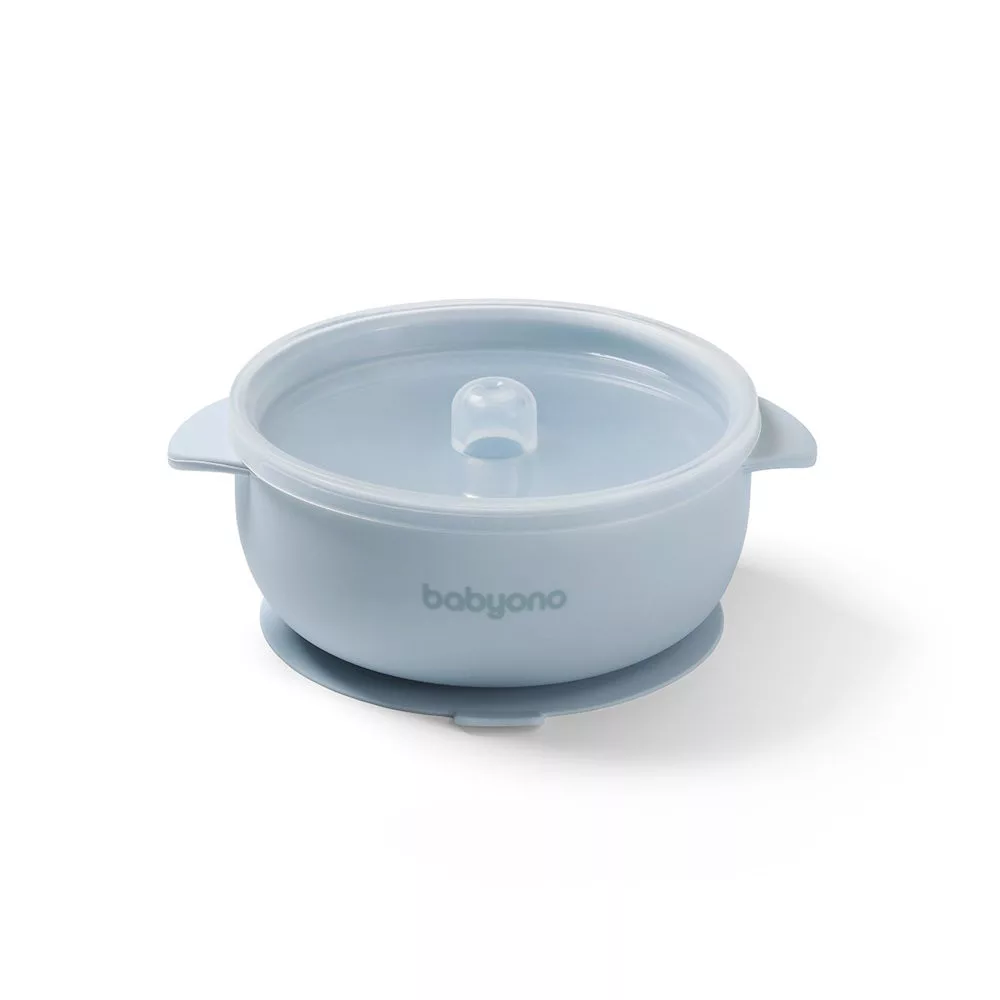 Új ízeket szeretnél bevezetni a baba étrendjébe? A Babyono szilikon tapadókorongos, fedeles tálkája segít a szilárd ételek bevezetésében a baba étrendjébe, és abban, hogy a kicsi megtanuljon önállóan enni. Használhatod levesek, tészták, zöldségek, gyümölcsök és joghurtok felszolgálására.Az erõs tapadókorongnak köszönhetõen a szilikon bébitál a helyén marad, még akkor is, ha a felfedezõkedvû baba el akarja dobni. A lekerekített széleknek köszönhetõen a baba önállóan is fel tudja szedni az ételt. A fedél viszont felelõs az étel frissen és melegen tartásáért, míg a csúszásgátló fogantyúk lehetõvé teszik a tál biztonságos mozgatását.A tapadókorongos BabyOno baba tál biztonságos, BPA-mentes és tartós szilikonból készült. Mikrohullámú sütõben és mosogatógépben is használható.Tökéletes elsõ bébitál, amelyet szilárd ételek bevezetésére használhatsz. Használható levesek, zabkása, joghurt, rizs, tészta, gyümölcsök és zöldségek felszolgálására. Arra ösztönzi a babát, hogy új ízeket fedezzen fel.Egy nagy tapadókorong tartja a tálat az eredeti helyén, még akkor is, ha a baba mozgatni vagy dobálni akarja. A kicsi az evésre koncentrálhat, és a szülõk elkerülhetik a rendetlenséget.A lekerekített éleknek és a magasabb falaknak köszönhetõen könnyebb ebbõl felszedni az ételt akár kézzel akár evõeszközzel. A baba örömmel fog enni, és közben fejleszti motorikus készségeit.A tapadókorongos babatál csúszásgátló fogantyúkkal rendelkezik, amelyek szilárdan tapadnak a tenyérbe. Biztonságosan viheted a tálkát kis kincsednek.A fogantyús fedelet a piacon kapható más, ilyen méretû tálkákon is használhatod. Így melegen és frissen tarthatod az ételt. Az ételeket tárolhatod a tálkában a hûtõszekrényben, vagy magatokkal vihetitek mikor utaztok. (A fedél megvéd a kiömlés ellen, de folyadék szivárgását nem akadályozza meg, ha a tálka az oldalára fordul.)A fedeles babatál biztonságos, BPA-mentes szilikonból készült. Ellenáll az eséseknek és a sérüléseknek. Nyugodtan melegítsd benne a baba ételét mikrohullámú sütõben.Szilikon babatálunk nem szívja magába a szagokat, és nem színezõdik el. Puha és sima anyagát könnyen elmoshatod folyó víz alatt vagy mosogatógépben is. Sokáig megõrzi újszerû megjelenését.BIZTONSÁGI INFORMÁCIÓKTávolítson el minden olyan biztonsági elemet, amely veszélyes lehet a gyermekre. Minden használat elõtt ellenõrizze a terméket. A sérülés vagy kopás elsõ jelére dobja ki. Mindig felnõtt felügyelete mellett használja. A termék nem játék. Javasoljuk, hogy a csomagolást õrizze meg tájékoztatásul. A csomagolást tartsa gyermekektõl elzárva. Elsõ használat elõtt forrázza le a terméket forrásban lévõ vízzel (ne forralja fel!), majd szárítsa meg. Mosogatógépben mosás esetén a program lejárta után azonnal vegye ki, és szárítsa meg. Ha a terméket mosás után a mosogatógépben hagyja, fennáll a deformáció veszélye.Mûszaki tulajdonságok:- Anyag: szilikon- Baba életkora: 6 hónapos kortól ajánlott- Termék mérete: 12 x 14,5 cm- Fontos! A termék egészségvédelmi és higiéniai terméknek minõsül. Amennyiben a csomagolás felbontásra került, vagy a kipróbálás jelei látszódnak a terméken, úgy a 14 napos elállási jog érvényét veszíti a 45/2014. (II. 26.) korm. rendelet 29. § (1) bekezdése alapján.Megjegyzés: A csomag csak a tányért és a fedõt tartalmazza, a képeken látható további termékek csupán illusztrációként szolgálnak.