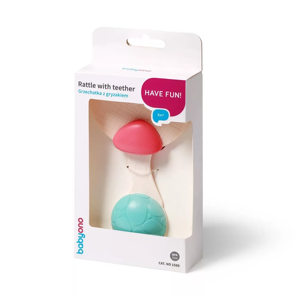 A BabyOno csörgõt és rágókát ötvözõ játéka tökéletes elsõ játék babája számára. Teljesen biztonságos és kellemes tapintású anyagokból készült.A csörgõ praktikus felépítésének köszönhetõen a baba könnyedén tudja a kis kezében tartani.A csörgõ ideálisnak bizonyul a koordináció és a kézi készségek vidám és biztonságos fejlesztésére.Stimuláló hangokMegrázva a csörgõ finom hangokat ad ki, amelyek felkeltik a baba figyelmét és fejlesztik hallását.Motoros készségek fejlesztéseA csörgõ praktikus felépítésének köszönhetõen a baba könnyedén tudja a kis kezében tartani. A rázás hozzájárul a csecsemõk motoros készségeinek fejlesztéséhez, segíti õket a kéz-szem koordináció és a tárgyak kezelésének serkentésében.RágókaA kellemes tapintású szilikon rágóka gyengéden dörzsöli a baba ínyét és enyhülést ad a fogzási idõszakban.Ajánlott életkor: 3 hónapos kortólA termék mérete: 8 x 14 cmA csomagolás mérete: 10x19 cmBiztonsági információk:Az elsõ használat elõtt forrázza le a terméket forrásban lévõ vízzel (ne forralja!), majd szárítsa meg. A napi karbantartáshoz meleg vízben, babaszappannal történõ mosást javasoljuk. Mosás után alaposan öblítse le és szárítsa meg. Használat elõtt távolítsa el a játékról az összes csomagolást és rögzítõelemet, amely veszélyes lehet a gyermekre. Minden alkalommal, amikor játékot ad egy gyermeknek, ellenõrizze annak minõségét. Csak egy sértetlen játék garantálja hogy gyermeke biztonságosan tudja használni. Dobja ki a játékot, amint észleli a sérülés elsõ jeleit. A játék felnõtt felügyelete mellett ajánlott. A játék megfelel az EN 71 szabványnak. Javasoljuk, hogy õrizze meg a csomagolást referenciaként. Tartsa a csomagolást gyermekektõl elzárva. A csomagolás és a rögzítõelemek nem játékok, és egészségügyi kockázatot jelenthetnek a gyermek számára.Gyártó: Babyono sp. z o.o.street Kowalewicka 13, 60-002 Poznañ, Polskainfo@babyono.pl