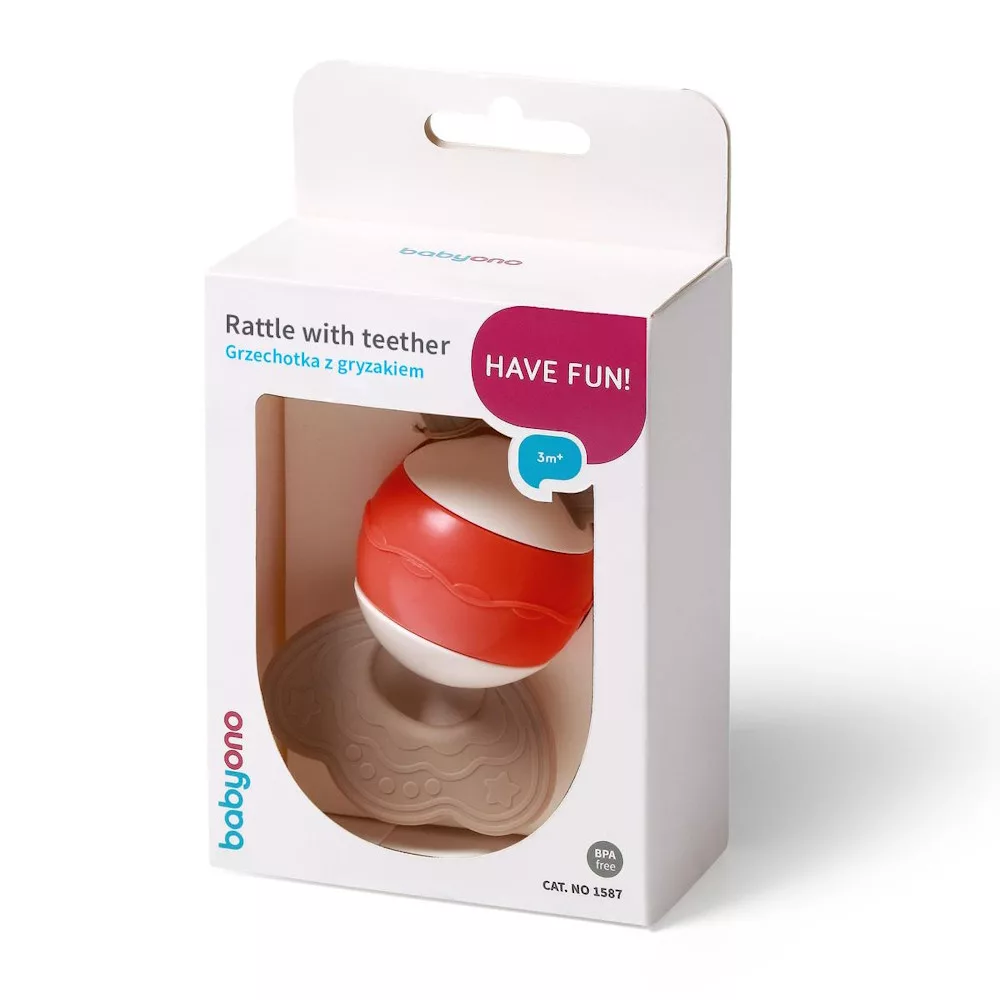 A BabyOno csörgõt és rágókát ötvözõ játéka tökéletes elsõ játék babád számára. Teljes egészében biztonságos és kellemes tapintású anyagokból készült.A csörgõ praktikus felépítésének köszönhetõen a baba könnyedén tudja a kis kezében tartani.A csörgõ ideálisnak bizonyul a koordináció és a kézügyesség vidám és biztonságos fejlesztésére.STIMULÁLÓ HANGOKRázogatásra a csörgõ finom hangokat ad ki, amelyek felkeltik a baba figyelmét és fejlesztik a hallását.MOTOROS KÉSZSÉGEK FEJLESZTÉSEA csörgõ praktikus kialakításának köszönhetõen a baba könnyen megfoghatja kis kezében. A rázás hozzájárul a babák motoros készségeinek fejlesztéséhez, segítve õket a kéz-szem koordináció és a tárgyak kezelésének serkentésében.RÁGÓKA ISA kellemes tapintású szilikon rágóka gyengéden dörzsöli a baba ínyét, és enyhülést nyújt a fogzási idõszakban.BIZTONSÁGI INFORMÁCIÓKElsõ használat elõtt forrásban lévõ vízzel forrázza le a terméket, majd szárítsa meg (ne forralja fel!). A napi karbantartáshoz meleg vízben, babaszappannal történõ mosást javasolunk. Mosás után alaposan öblítse le és szárítsa meg. Mielõtt a gyermeknek adná, távolítson el minden biztonsági elemet a játékról, amely veszélyes lehet a gyermekre. Minden alkalommal mielõtt játékot adna a gyermek kezébe, ellenõrizze annak minõségét. Csak a sértetlen játék garantálja gyermeke biztonságos játékát. A terméket a sérülés elsõ jelei észlelésekor azonnal dobja ki. A játék felnõtt felügyelete mellett ajánlott. A játék megfelel az EN 71 szabványnak. Javasoljuk, hogy õrizze meg a csomagolást. A csomagolást tartsa gyermekektõl elzárva. A csomagolás és a rögzítõk nem játék, és egészségügyi kockázatot jelenthetnek a gyermek számára.Mûszaki tulajdonságokBaba életkora: 3 hónapos kortólTermék mérete: 8x 11 cmDoboz mérete: 9x15 cmGyártó: Babyono sp. z o.o.street Kowalewicka 13, 60-002 Poznañ, Polskainfo@babyono.pl