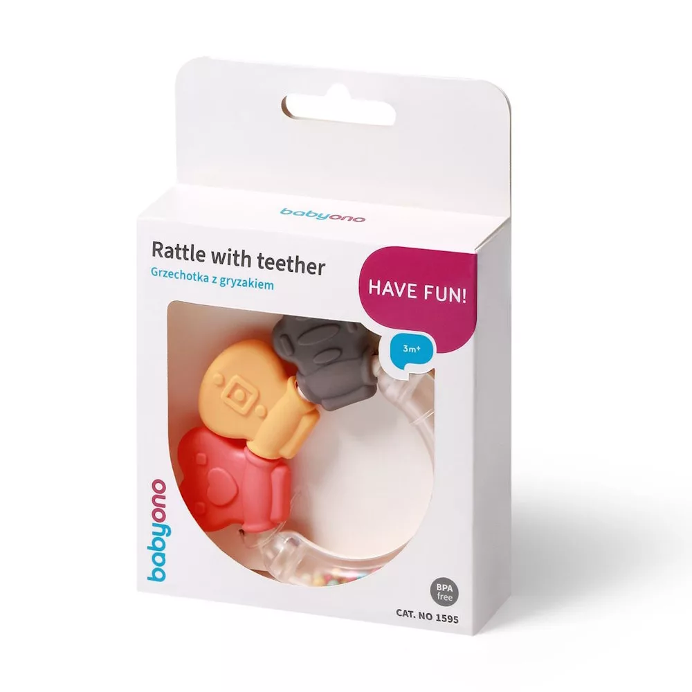 A BabyOno csörgõt és rágókát ötvözõ játéka tökéletes elsõ játék babája számára. Teljesen biztonságos és kellemes tapintású anyagokból készült. A csörgõ praktikus felépítésének köszönhetõen a baba könnyen tudja tartani kis kezében. A csörgõ ideálisnak bizonyul a koordináció és a kézi készségek vicces és biztonságos fejlesztésére.Stimuláló hangokMegrázva a csörgõ finom hangokat ad ki, amelyek felkeltik a baba figyelmét és fejlesztik hallását.Motoros készségek fejlesztéseA csörgõ praktikus felépítésének köszönhetõen a baba könnyedén tudja a kis kezében tartani. A rázás hozzájárul a csecsemõk motoros készségeinek fejlesztéséhez, segíti õket a kéz-szem koordináció és a tárgyak kezelésének serkentésében.RágókaA kellemes tapintású szilikon rágóka gyengéden dörzsöli a baba ínyét és enyhülést ad a fogzási idõszakban.Ajánlott életkor: 3 hónapos kortólA termék mérete: 8 x 8 cmA csomagolás mérete: 10x14 cmBiztonsági információk:Az elsõ használat elõtt forrázza le a terméket forrásban lévõ vízzel (ne forralja!), majd szárítsa meg. A napi karbantartáshoz meleg vízben, babaszappannal történõ mosást javasoljuk. Mosás után alaposan öblítse le és szárítsa meg. Használat elõtt távolítsa el a játékról az összes csomagolást és rögzítõelemet, amely veszélyes lehet a gyermekre. Minden alkalommal, amikor játékot ad egy gyermeknek, ellenõrizze annak minõségét. Csak egy sértetlen játék garantálja hogy gyermeke biztonságosan tudja használni. Dobja ki a játékot, amint észleli a sérülés elsõ jeleit. A játék felnõtt felügyelete mellett ajánlott. A játék megfelel az EN 71 szabványnak. Javasoljuk, hogy õrizze meg a csomagolást referenciaként. Tartsa a csomagolást gyermekektõl elzárva. A csomagolás és a rögzítõelemek nem játékok, és egészségügyi kockázatot jelenthetnek a gyermek számára.Gyártó: Babyono sp. z o.o.street Kowalewicka 13, 60-002 Poznañ, Polskainfo@babyono.pl