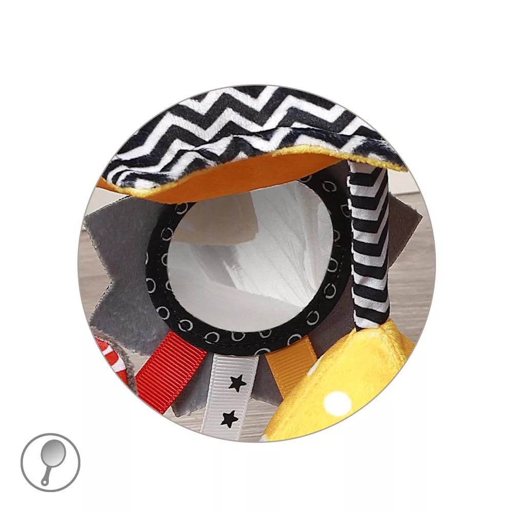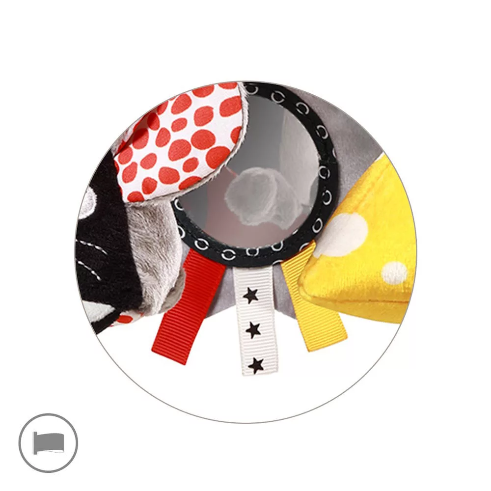 Kontrasztos babajátékunk egy érzékszervi körhinta, tele meglepetésekkel! A vidám egérrel való játék serkenti a kicsi képzelõerejét, érzékeit és motoros fejlõdését.Két csörgõvel és susogó elemmel szereltük fel, amelyek serkentik a hallást, színes címkékkel és egy göndör farokkal, amelyek ösztönzik a fogást, valamint egy biztonságos tükörrel, hogy felfedezhessék a saját tükörképüket. Kontrasztos színekben és geometrikus mintákkal alkottuk meg, hogy az élet elsõ hónapjaitól kezdve fejlessze a látást.A babajátékot babakocsira vagy autósülésre rögzítheted, így fejlesztõ szórakozást nyújt séták és utazások során.JELLEMZÕKEz a babakocsi játék csörgõkkel rendelkezik, amelyek kellemes hangokat adnak ki – a sajtban hangosabbak, az egérben pedig finomabbak. Mozgásra ösztönzik, serkentik a hallást és szórakoztatják. A kicsi imádni fogja a fogást, a rázogatást és a hallgatást.PRAKTIKUS FOGANTYÚAz univerzális fogantyúnak köszönhetõen a játékot babakocsira, kiságyra vagy autósülésre is felakaszthatja. Könnyen fel- és levehetõ. Tökéletes társ a fejlesztõ játékhoz otthon, séták során és utazás közben.CSÖRGÕ FÜLEKCsak érintse meg az egér fülét, hogy egy érdekes susogó hangot halljon. A finom hang a felfedezésre ösztönöz az érintésen és a szorításon keresztül. A kicsi finoman fejleszti hallását és érzékszervi érzékenységét.TÜKÖRA tükör biztonságos mûanyagból készült. A tükörkép nézése elõsegíti az önismeret és a kéz-szem koordináció fejlõdését. Még lenyûgözõbbé teszi a játékot!SZÍNES CÍMKÉKA kontrasztos babamobilt a legkisebb gyermekek igényeit szem elõtt tartva terveztük. A fekete-fehér kontrasztok, valamint a piros és sárga díszítések az elsõ színek, amelyeket a baba észrevesz. Ezek serkentik a látást az élet elsõ hónapjaitól kezdve.KONTRASZT SZÍNEKA kontrasztos színû és geometrikus mintázatú, kiálló szalagok szemet gyönyörködtetõek. Érdekes textúrájuk ösztönzi a tapintást. A gyerekek lelkesen nyúlnak feléjük, gyakorolva a fogásukat.
