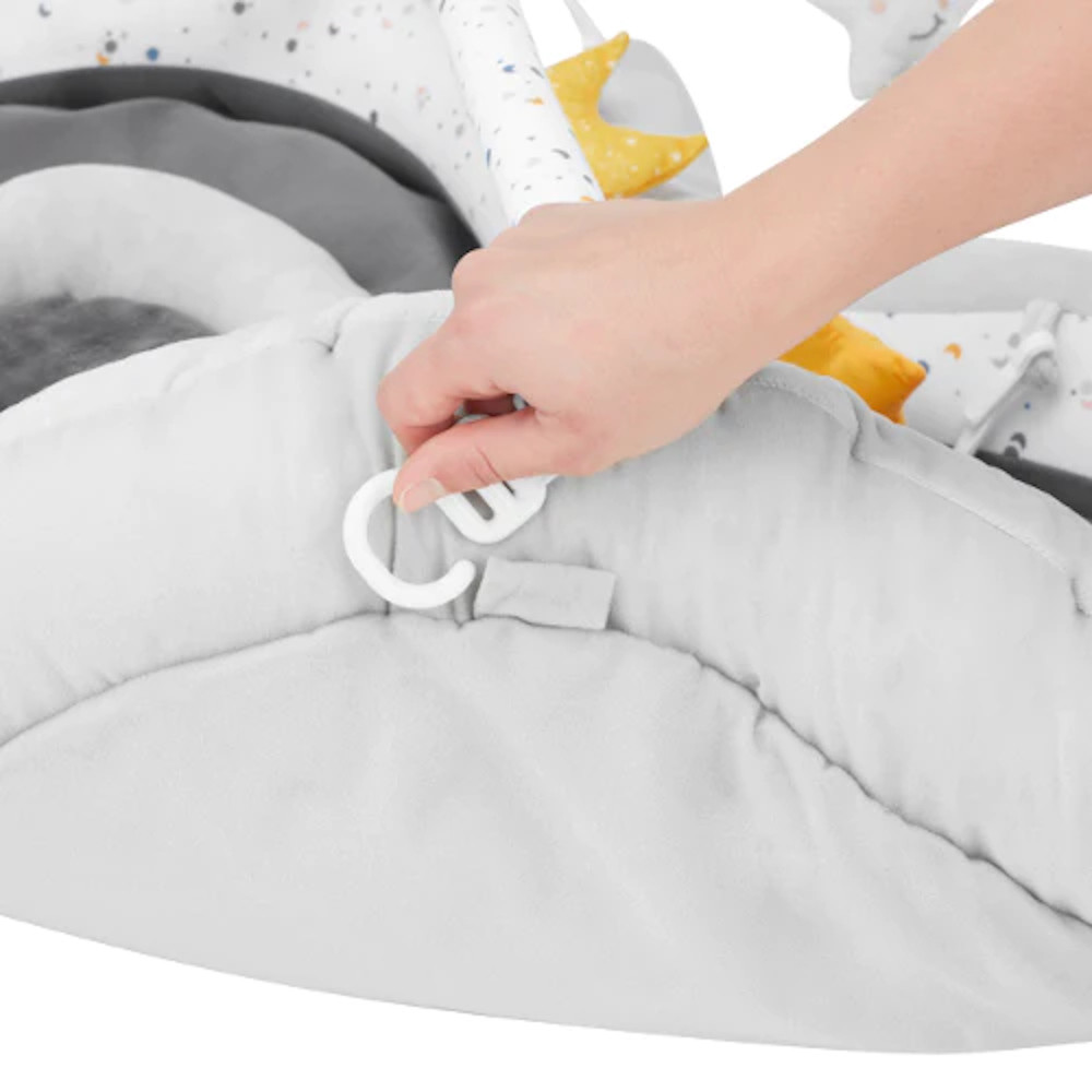 Megnyugtató gubóIdõnként mindkét kezedre szükséged van egy üveg elkészítéséhez, öltözködéshez, aperitif elkészítéséhez a családdal... A Badabulle játszószõnyeg tökéletes szövetséges, hogy megkönnyítse gyermeke felébresztését, miközben lehetõvé teszi, hogy Ön a maga mellett tartsa õt. Az újszülött szûkítõ betétnek köszönhetõen a babája nagyon kényelmesen elhelyezhetõ a fészekben születésétõl fogva.Ez a kivehetõ és áthelyezhetõ szûkítõ betét tökéletesen a hátán tartja a babát, és megnyugtató gubót alkot. A szõnyeg nagyon puha és kényelmes. Megemelt kontúrja párnázott. A babád nem gurul le a szõnyegrõl!Az ébredést elõsegítõ környezetAz ébredés elõsegítésére 3 játékot tartalmaz. Az ívhez hasonlóan a játékok is eltávolíthatók, és a szõnyegen több helyre rögzíthetõk a gyermek életkorától és méretétõl függõen. Gyerekként közelebb helyezed hozzá a játékokat a szõnyeg szélére, felnõve például a kettõs íven mozgatod õket.Praktikus, ez az aktív szõnyeg babajárókába is becsúsztatható. Nagyon könnyen összecsukható a könnyû tárolás és szállítás érdekében. A szõnyeg közepe levehetõ és mosógépben (30°) mosható.Mérete: kb.: 100 x 65 x 10cm