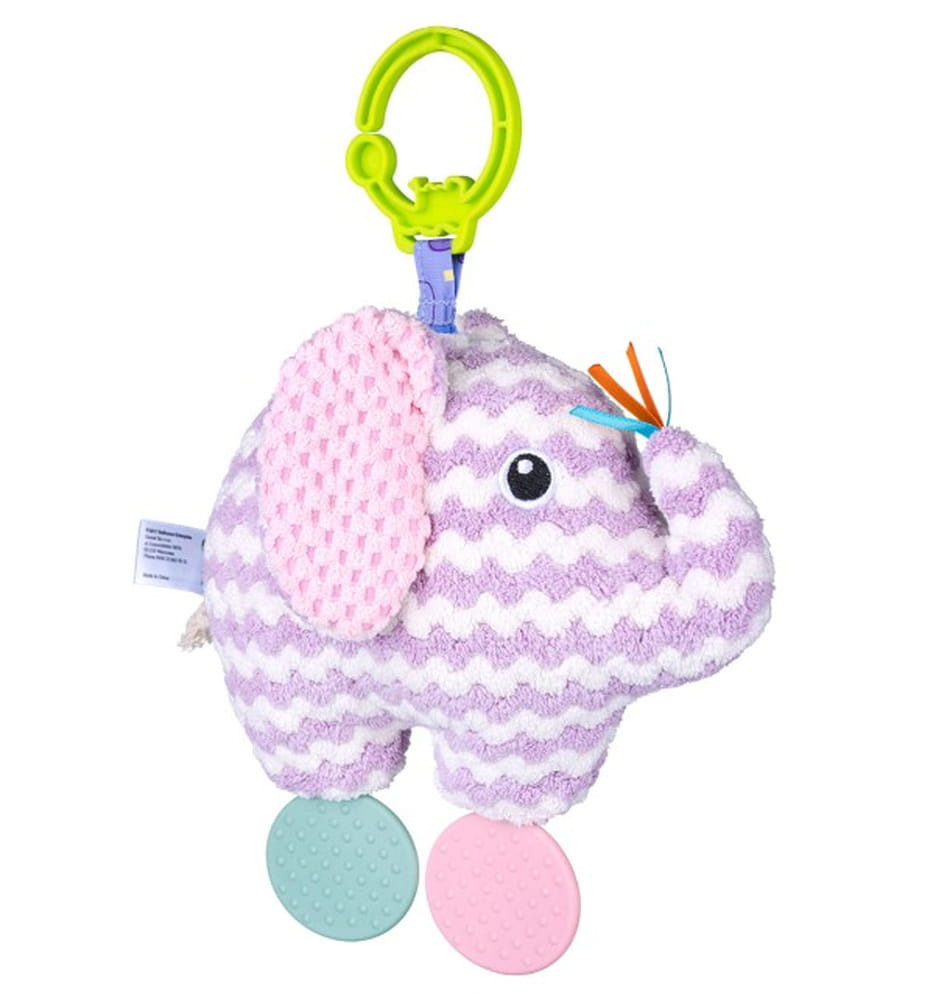 Ez a gyönyörű, pasztell színű házi kedvenc testét különböző textúrájú anyagokból készítették, ami stimulálja a gyermek tapintási érzékelését és elősegíti kognitív képességeinek fejlődését. Ezenkívül rágcsálnivalók és egy csengő is található rajta, amely az elefántocska hasában van elrejtve. A kényelmes fogantyú lehetővé teszi, hogy a játékot bárhová magával vigye.