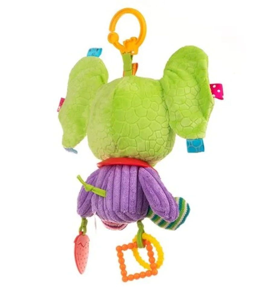 Ez a gyönyörű, pasztell színű házi kedvenc testét különböző textúrájú anyagokból készítették, ami stimulálja a gyermek tapintási érzékelését és elősegíti kognitív képességeinek fejlődését. Ezenkívül rágcsálnivalók és egy csengő is található rajta, amely az elefántocska hasában van elrejtve. A kényelmes fogantyú lehetővé teszi, hogy a játékot bárhová magával vigye.