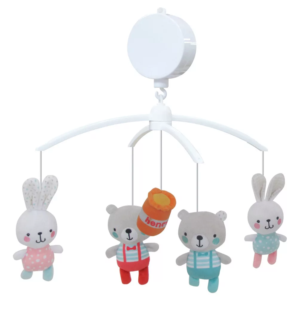 A zenélő forgó kellemes, nyugtató dallamokat játszik, miközben a plüss figurák lassan forognak a baba felett. Ez a kombináció segít: