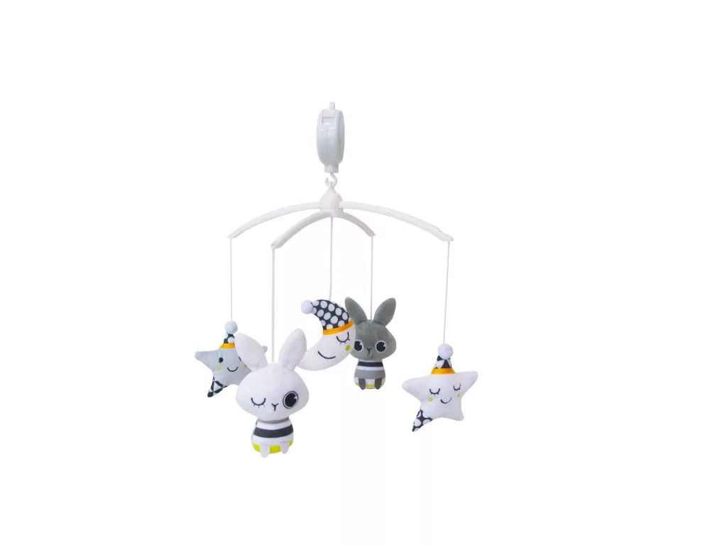 A zenélő forgó kellemes, nyugtató dallamokat játszik, miközben a plüss figurák lassan forognak a baba felett. Ez a kombináció segít: