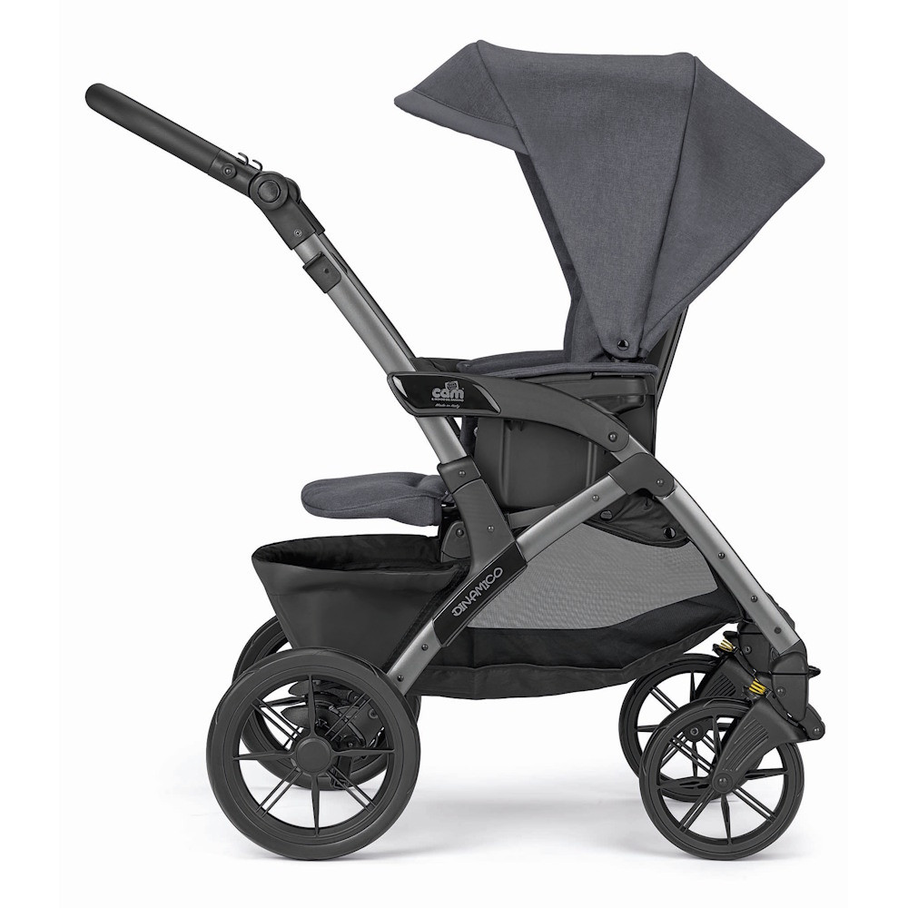 Cam Dinamico Smart Duo! Modern, igényes kivitelezésû, kiváló minõségû anyagok felhasználásával létrejött babakocsi, amely tökéletes társatok lesz a babás mindennapokban!Újszülött kortól használható, 0-4 éves korig (22 kg)Tartalma: babakocsi váz üléssel (naptetõvel), mózeskosárral (kupolával és lábtakaróval), és pelenkázótáskaMózeskosár:- Tágasabb és mélyebb mózeskosár a maximális kényelem érdekében- A gyors rá- és lecsatlakoztatást segítõ Quicky System-mel felszerelve- Csúszásmentes fogantyú innovatív egykezes rögzítõ- és kioldórendszerrel- Megemelhetõ háttámla (4 pozíció!)- Matrac- 100% pamut belsõ huzat- Lábtakaró szélvédõvel, mely a babakocsiban lábzsákként használható- Légáteresztõ alj- Ringató funkció- Nagy, trendi pelenkázótáskávalSportbabakocsi:- Alumínium váz megfordítható üléssel (szülõre nézõ 0-1 év, elõre nézõ 1-4 év)- Gyors rögzítés/kioldás Quicky System mózeskosárhoz és autósüléshez- Állítható magasságú tolókar szivacs borítással- Könnyen levehetõ nagy hátsó kerekek fém golyóscsapágyakkal- Fixálható bolygókerék elöl - Központi fék- Lágy elsõ és hátsó felfüggesztés- Egy kézzel könnyedén 4 pozícióba állítható háttámla- Állítható lábtartó- Levehetõ kapaszkodó- 5 pontos biztonsági öv- Tágas bevásárlókosár praktikus nyitórendszerrelBármely irányba felszerelt ülõrésszel kompakt méretûre csukható, mint egy könyv, és összecsukva önmagában megáll.Tartozékai:- Naptetõ- Bevásárlókosár- Lábzsák (a mózeskosárról)Kompatilbilis termékek:A Cam Dinamico Smart Duo babakocsi vázára csatlakoztatható - a Cam Area Zero (CAM hordozó Area Zero Plusz I-Size 40-75cm Dinamico és Fluido babakocsikra 761 fekete) vagy - a Cam Relax i-Size (CAM hordozó Relax I-Size 40-87cm Dinamico és Fluido babakocsikra 761 fekete) babahordozó, melyek külön megvásárolható termékek, - illetve kapható vele kompatibilis univerzális adapter, melyre több márka (pl. Maxi-Cosi, BeSafe) hordozója rögzíthetõ.Méretei:- Összecsukva (váz): 29 x 57 x 87 cm Súly: 7,5 kg- Mózeskosárral: 57 x 90,5 x 117 cm Súly: 12,4 kg- Mózeskosár belsõ méret: 83 x 36 x 22-20 cm Súly: 4.9 kg- Sportbabakocsi: 57 x 87,5 x 100 cm Súly: 10,3 kg CAM :A CAM vállalatot 1969-ben alapította 3 vállalkozó kedvû testvér. Kis családi vállalkozásból a bébiszektor egyik legfontosabb vállalatává nõtte ki magát. Sikerük abban rejlik, hogy a gyermekek szemével tekintenek a világra. Legfõbb céljuk, hogy egyszerûbbé és kényelmesebbé tegyék a családok életét termékeik segítségével. A CAM-re jellemzõek a kreatív ötletek, multifunkcionális és stílusos megjelenésû termékek, melyekkel garantálják a minõséget.Biztonság• Európai szabvány: EN1888-1/2 : 2018 A1:2022• Fékpróba: a nagyobb biztonság érdekében kötelezõ a kapcsolt fék használata• 360 forgási teszt: az 5 pontos biztonsági heveder ellenállását teszteli• Kopásvizsgálat: teszteli a babakocsi szilárdságát egy akadálypályán, szimulálva a használatot és a termék idõbeli kopását.• Véletlen összecsukás teszt: a véletlen összecsukást megakadályozó kettõs biztonsági mechanizmust teszteli• Nem mérgezõ (EN71) és ftalátmentes anyagok (2005/84/CE irányelv)• Tartóssági teszt egyenetlen utakon. Az európai szabályozás elõírja, hogy a tesztet 72 000 körön kell elvégezni, a Cam 500 000 körön végzi el a tesztet• A tolókar és a felfüggesztés tartóssági tesztje. Az európai szabályozás elõírja, hogy a tesztet 10 000 körön kell elvégezni, a Cam 30 000 körön végzi el a tesztet