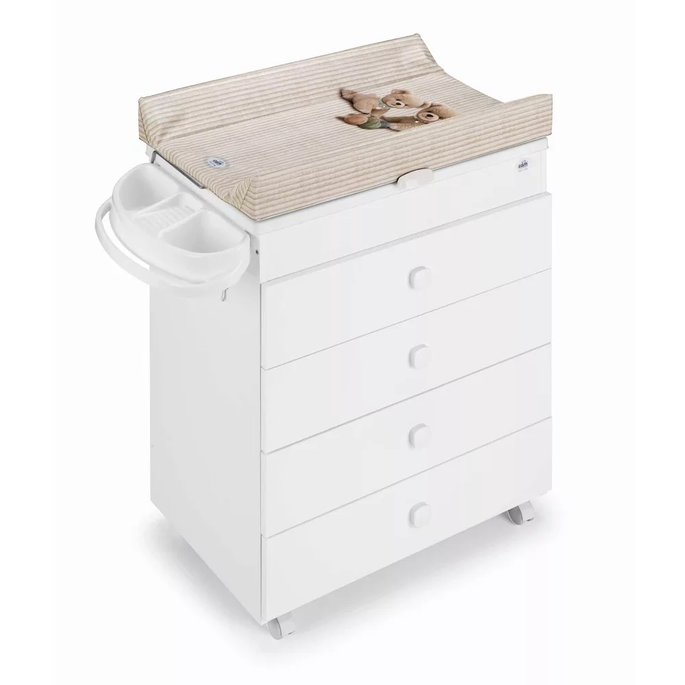 Többfunkciós fürdetõ és pelenkázó szekrény fiókokkalOlaszországban készült- újszülött kortól használható- egy kézzel is könnyen felhajtható merev aljú, puha pelenkázólap leesésgátló oldalakkal- része a babakád két anatómiailag formázott üléssel: egyik ülés döntött, a 0-6 hónapos babák fektetve fürdetéséhez és a másik ülés karfás, a 6-12 hónapos babák ültetve fürdetéséhez- szappan-, szivacs- és törölkõzõtartók– fürdõvíz-leeresztõ csõvel és dugóval– 4 görgõvel, melyekbõl 2 fékezhetõ– fürdetõszekrény formájában 3 teljes értékû fiókkal– normál, 4 fiókos komóddá alakítható a tetejére tehetõ fa lappal- a fiókok fém sínekben siklanakMaximum terhelhetõsége: 11 kgMéretei: komód káddal és pelenkázólappal: 93x47x100,5 cm komód: 76x47x89 cmSúlya: 44kgBiztonság: - Európai szabvány: EN12221-1/2- Korosztály:Ideális kisbabáknak a 11 kg-os súly eléréséig- Oldalsó, elsõ és hátsó stabilitási teszten ment át, elkerülendõ azt a veszélyt, hogy a termék felboruljon használat közben- Nincs benne mérgezõ anyag (EN71 szabvány) és ftalátmentes anyagokból készült (2005/84/CE irányelv)