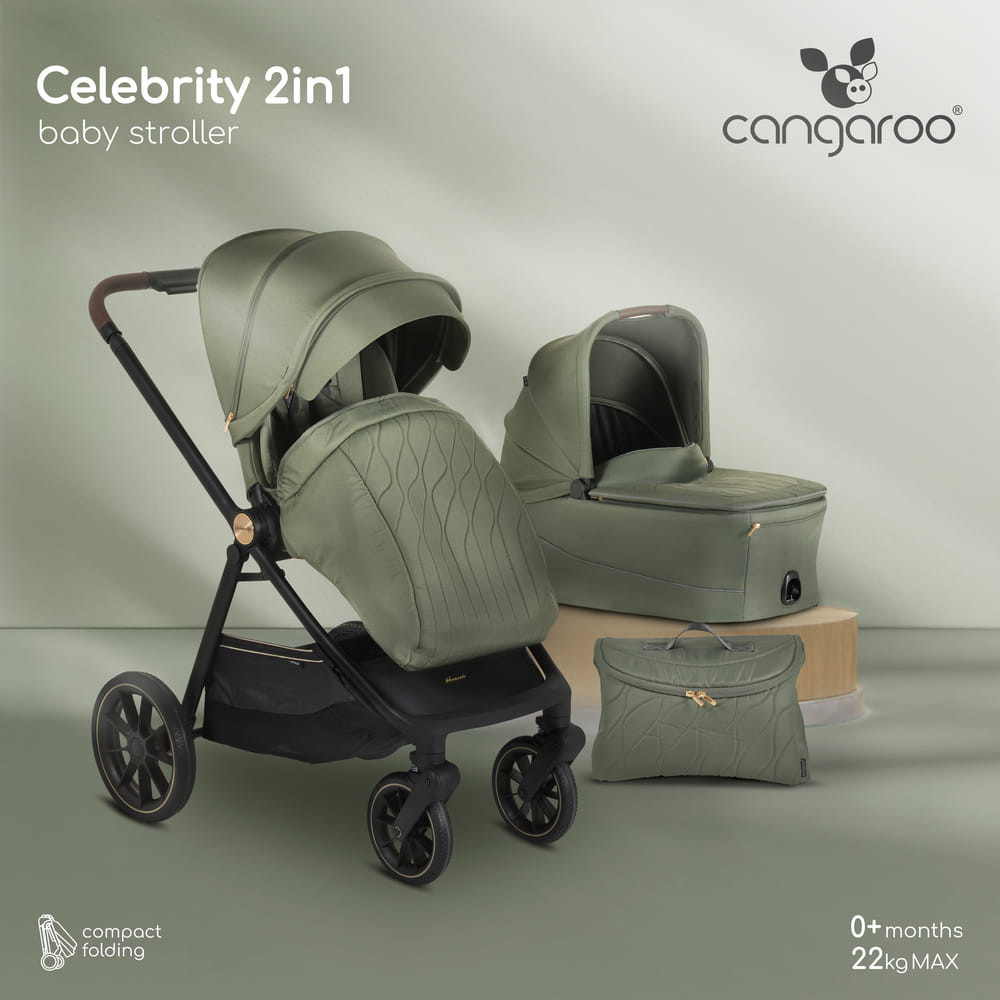 Cangaroo Celebrity multifunkcionális 2 részes babakocsi, amelyet a szülők dinamikus mindennapjait és a gyermek teljes kényelmét szem előtt tartva terveztek. Alkalmas a gyermekek számára születéstől 4 éves korig (vagy 22 kg-ig). Könnyen összecsukható, simán kezelhető, és számos kényelmi funkciót kínál - tökéletes városi használatra és szabadtéri sétákra egyaránt.