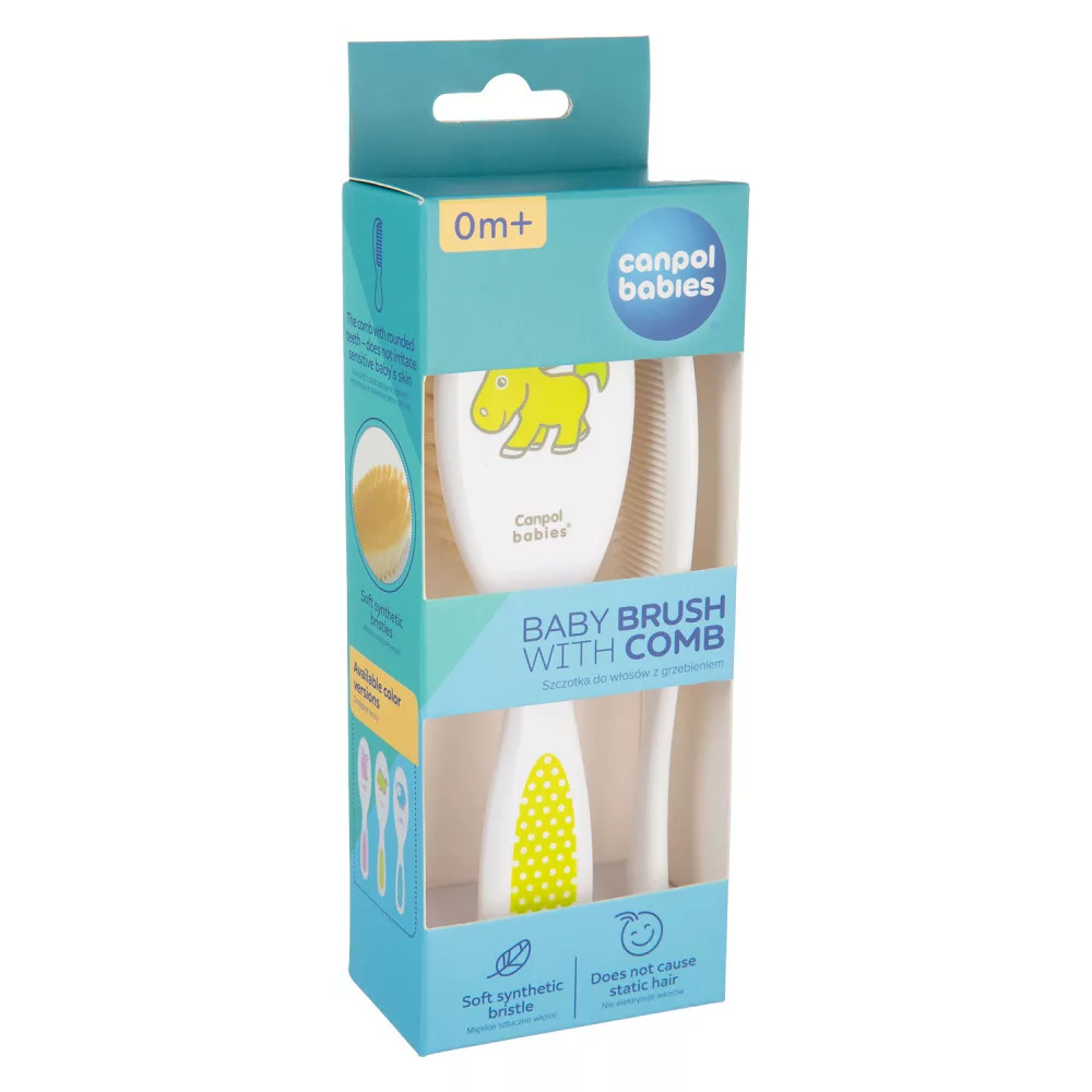 A szett egy puha sörtés hajkefét egy fésűt tartalmaz a baba hajának mindennapi ápolásához. A fésűnek lekerekített fogai vannak, amelyek nem irritálják a baba érzékeny bőrét. A kefe gyengéden masszírozza a baba fejét anélkül, hogy a hajat feltöltené elektromosággal. Tökéletes a születés utáni első napoktól kezdve. Többféle színben kapható.