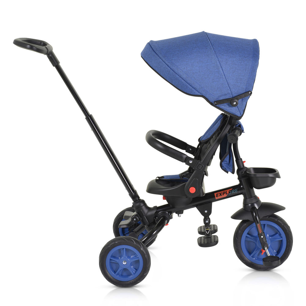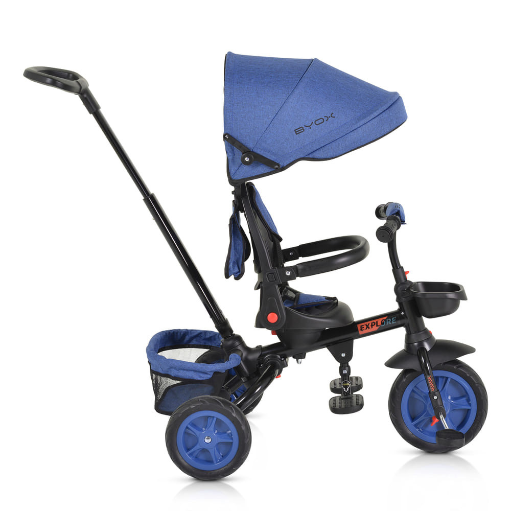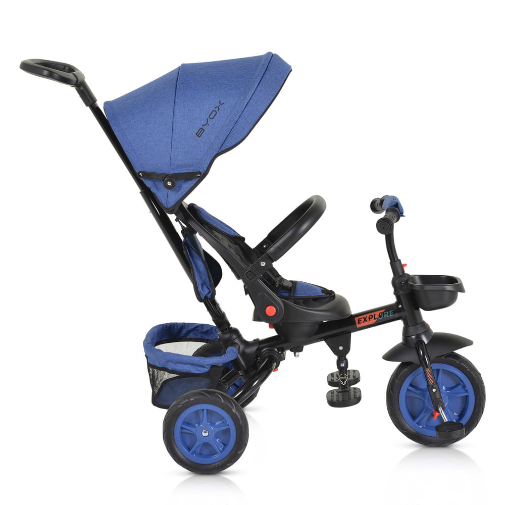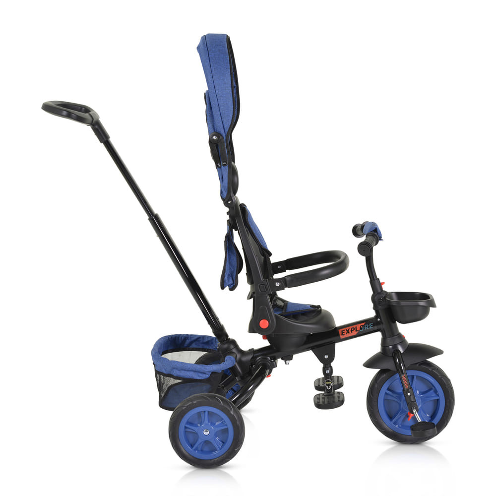 Kerekek - gumi, nem felfújható. Első kerék állítható szabadonfutó funkcióra. Levehető biztonsági karfa, 3 pontos biztonsági övek. Két hátsó fék. Első és hátsó játékkosár. Táska a tartozékok számára.