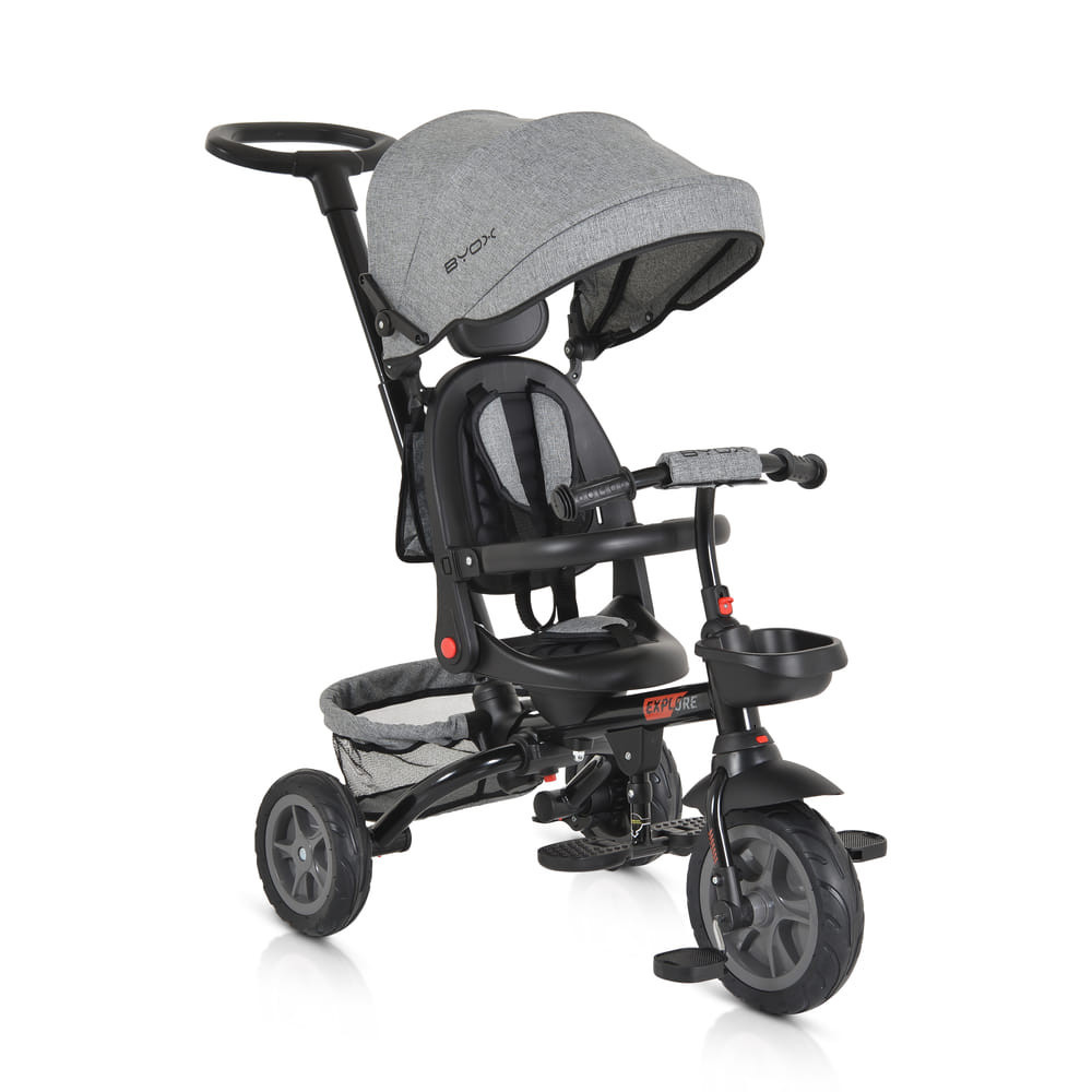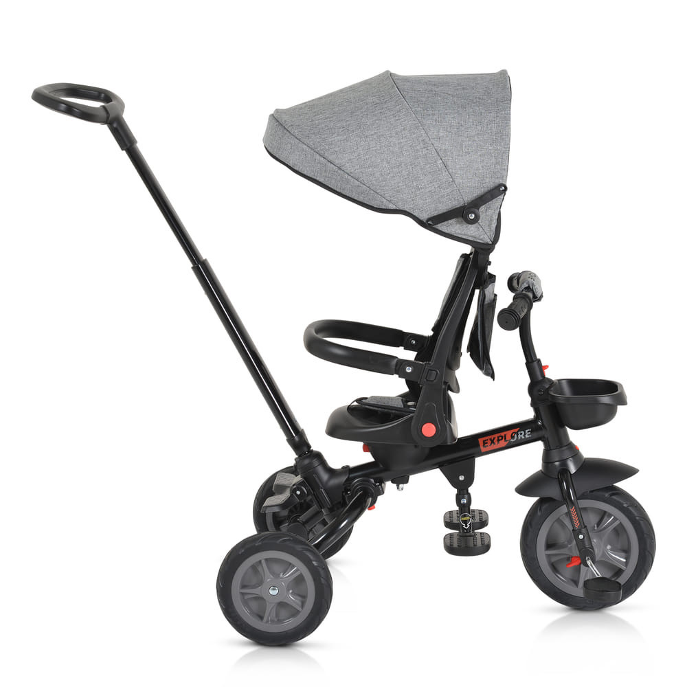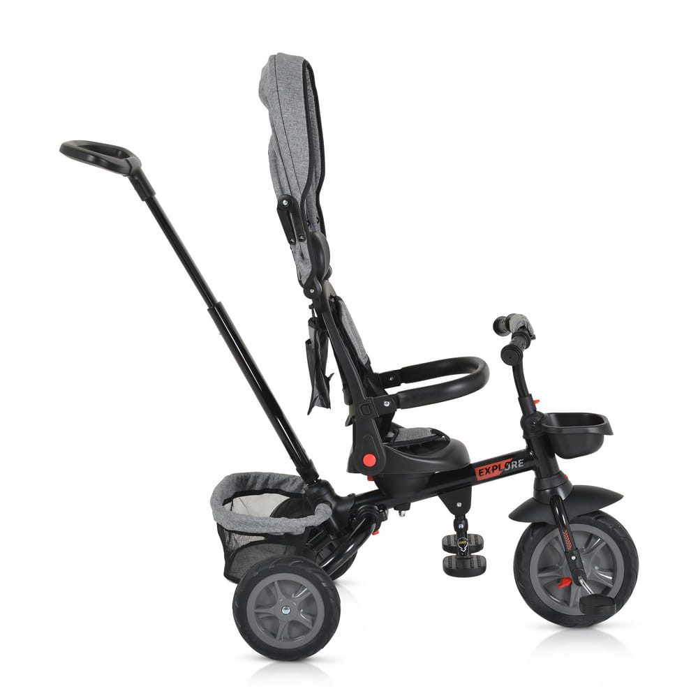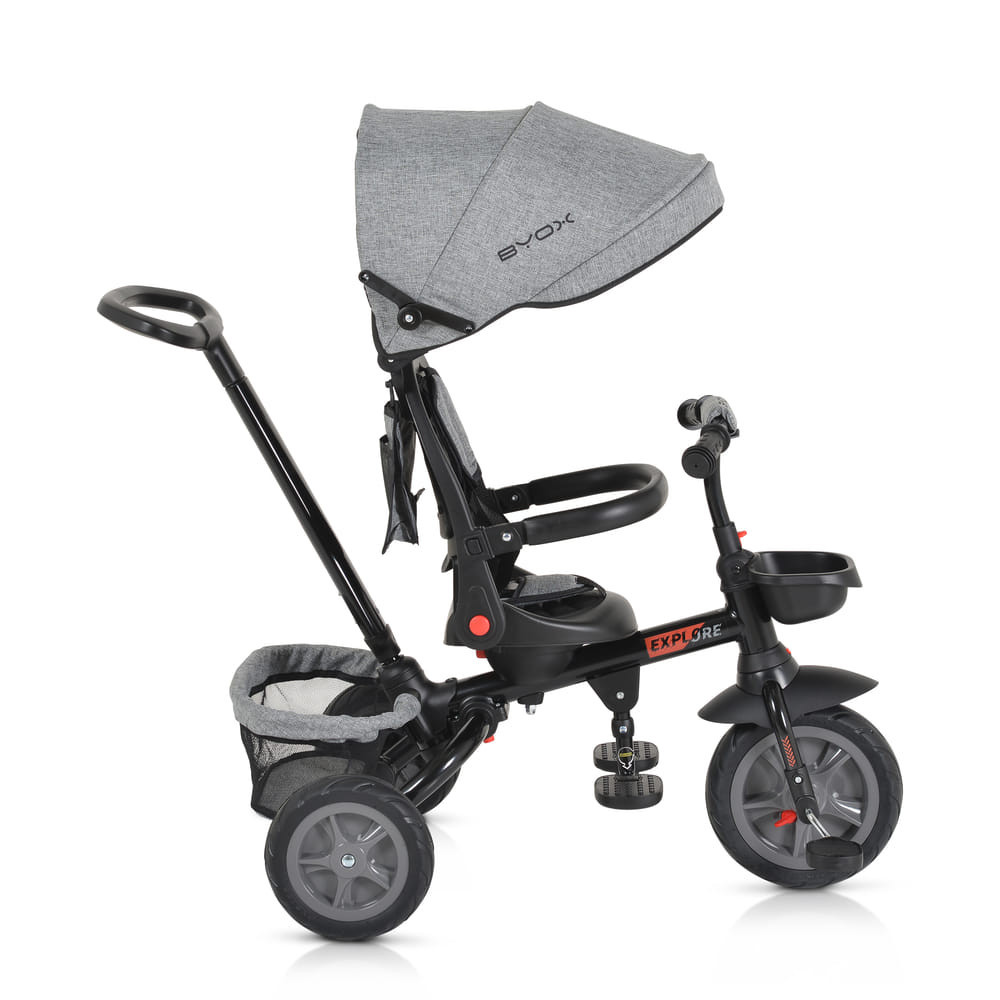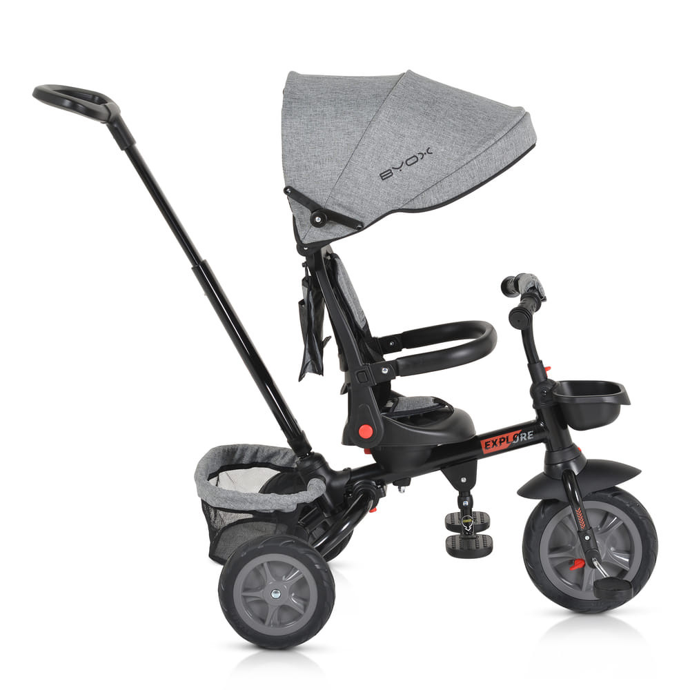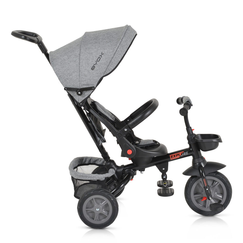 Kerekek - gumi, nem felfújható. Első kerék állítható szabadonfutó funkcióra. Levehető biztonsági karfa, 3 pontos biztonsági övek. Két hátsó fék. Első és hátsó játékkosár. Táska a tartozékok számára.