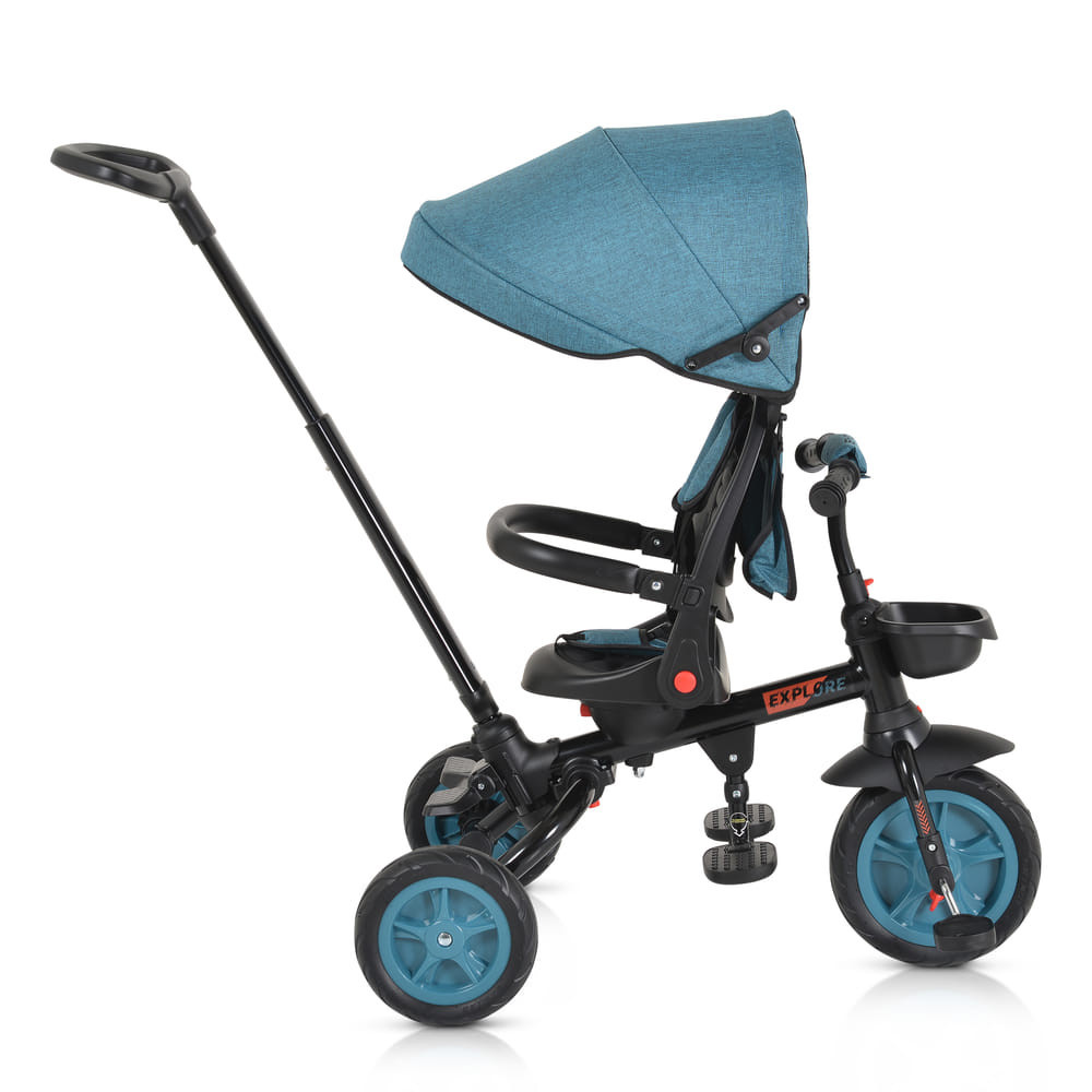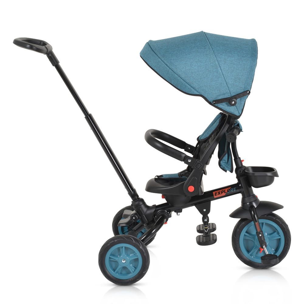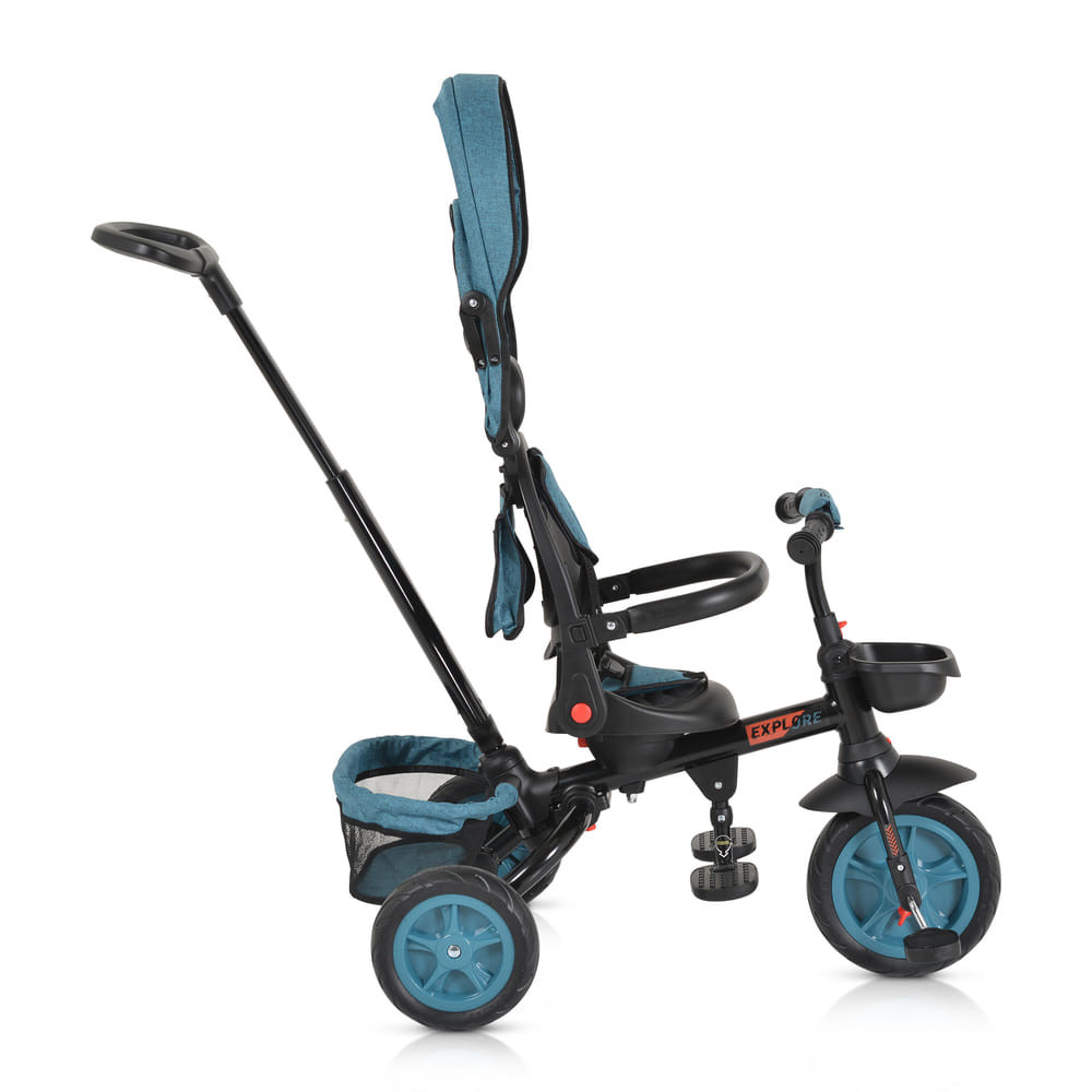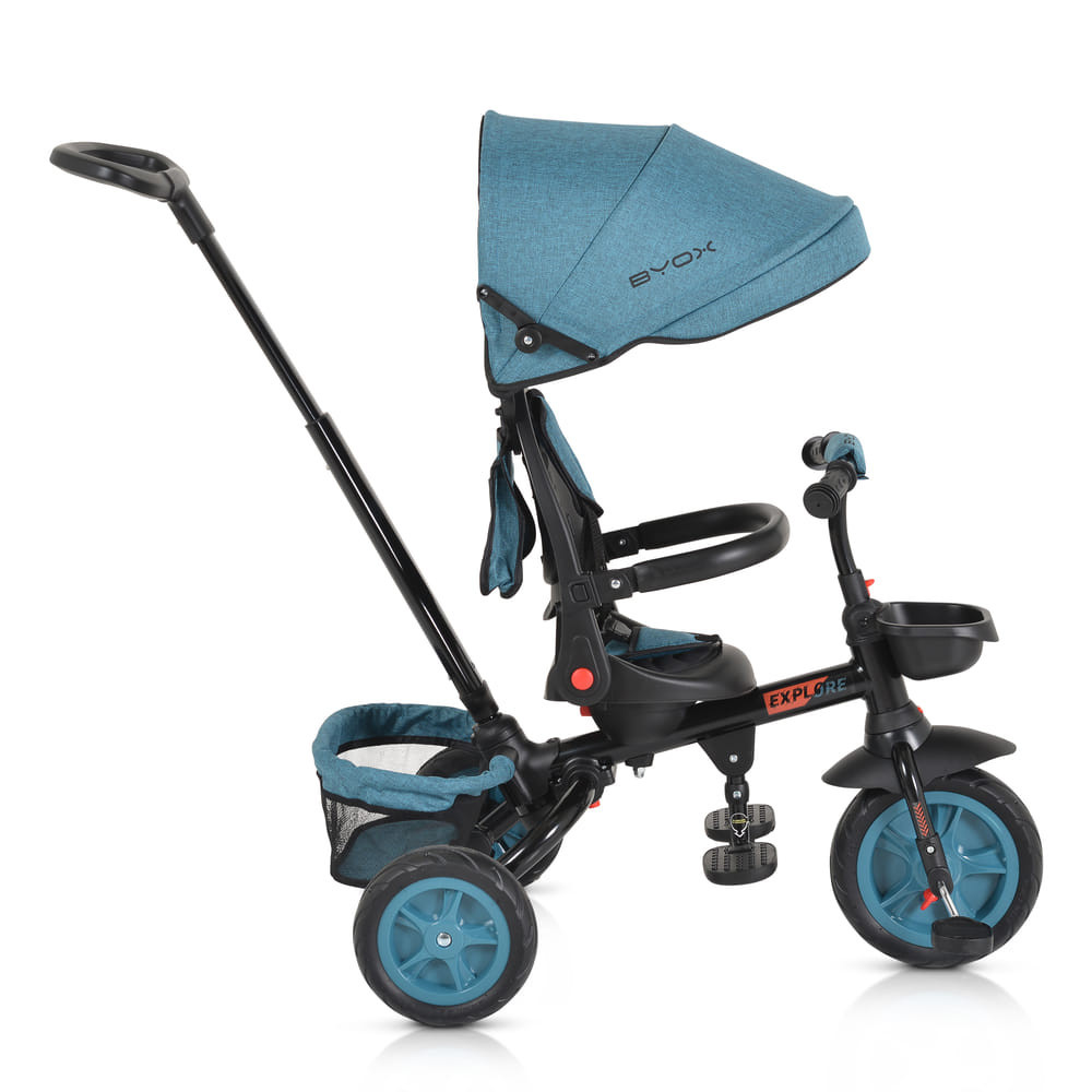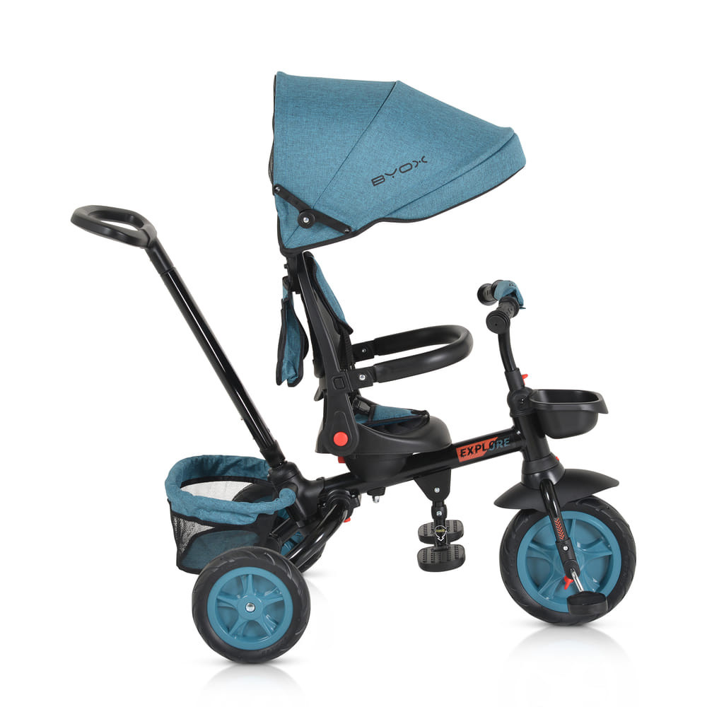 Kerekek - gumi, nem felfújható. Első kerék állítható szabadonfutó funkcióra. Levehető biztonsági karfa, 3 pontos biztonsági övek. Két hátsó fék. Első és hátsó játékkosár. Táska a tartozékok számára.