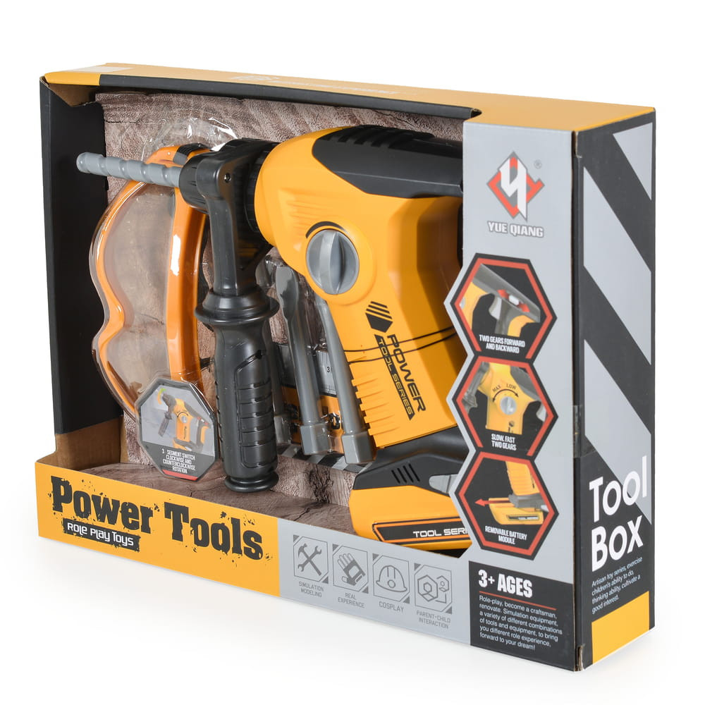 Ez a készlet tartalmaz egy elektromos fúrót forgó tartozékkal, védő szemüveget és egyéb tartozékokat, amelyek a valódi szerszámos
