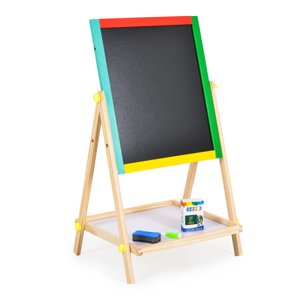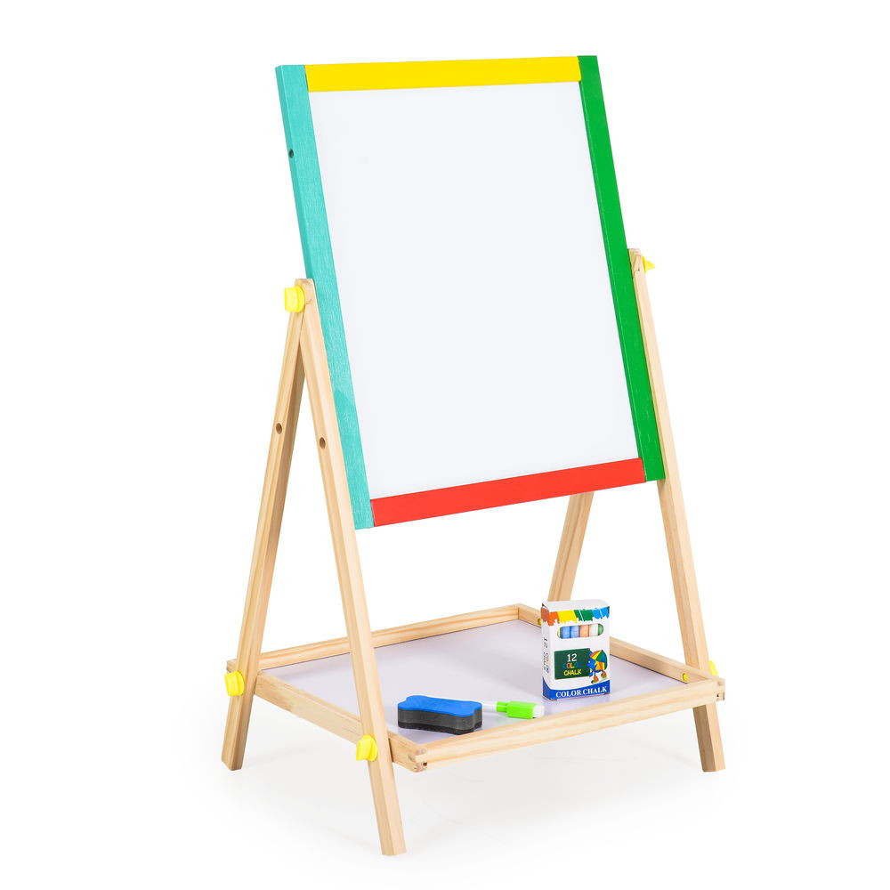 Fából készült rajztábla, markerrel, szivaccsal és krétával.