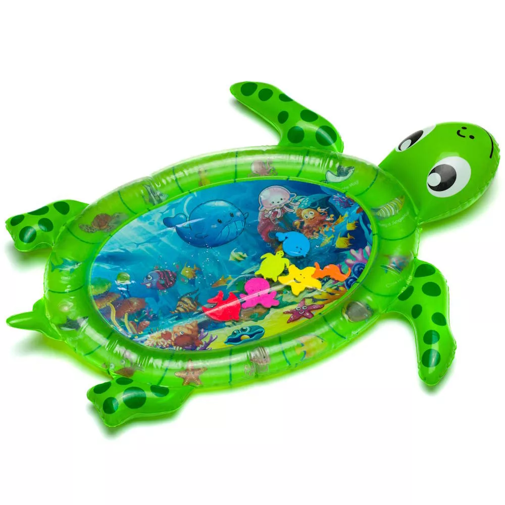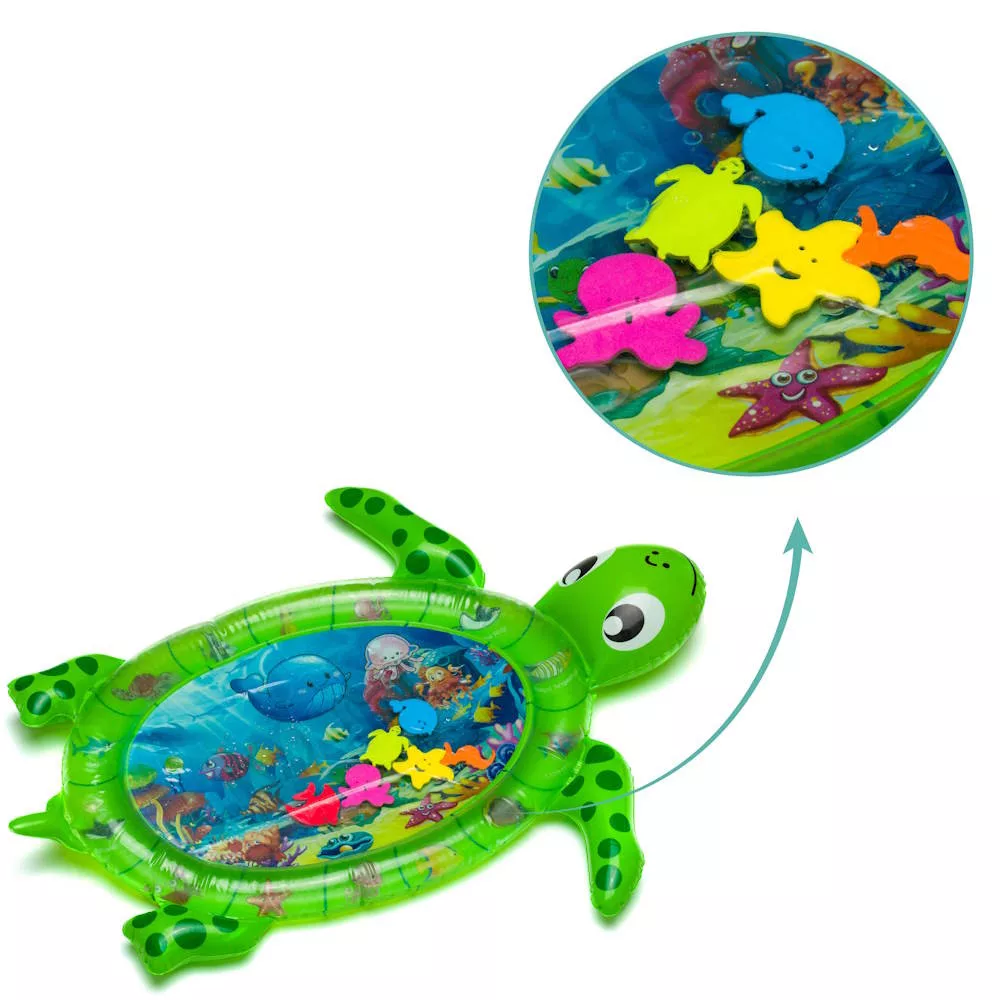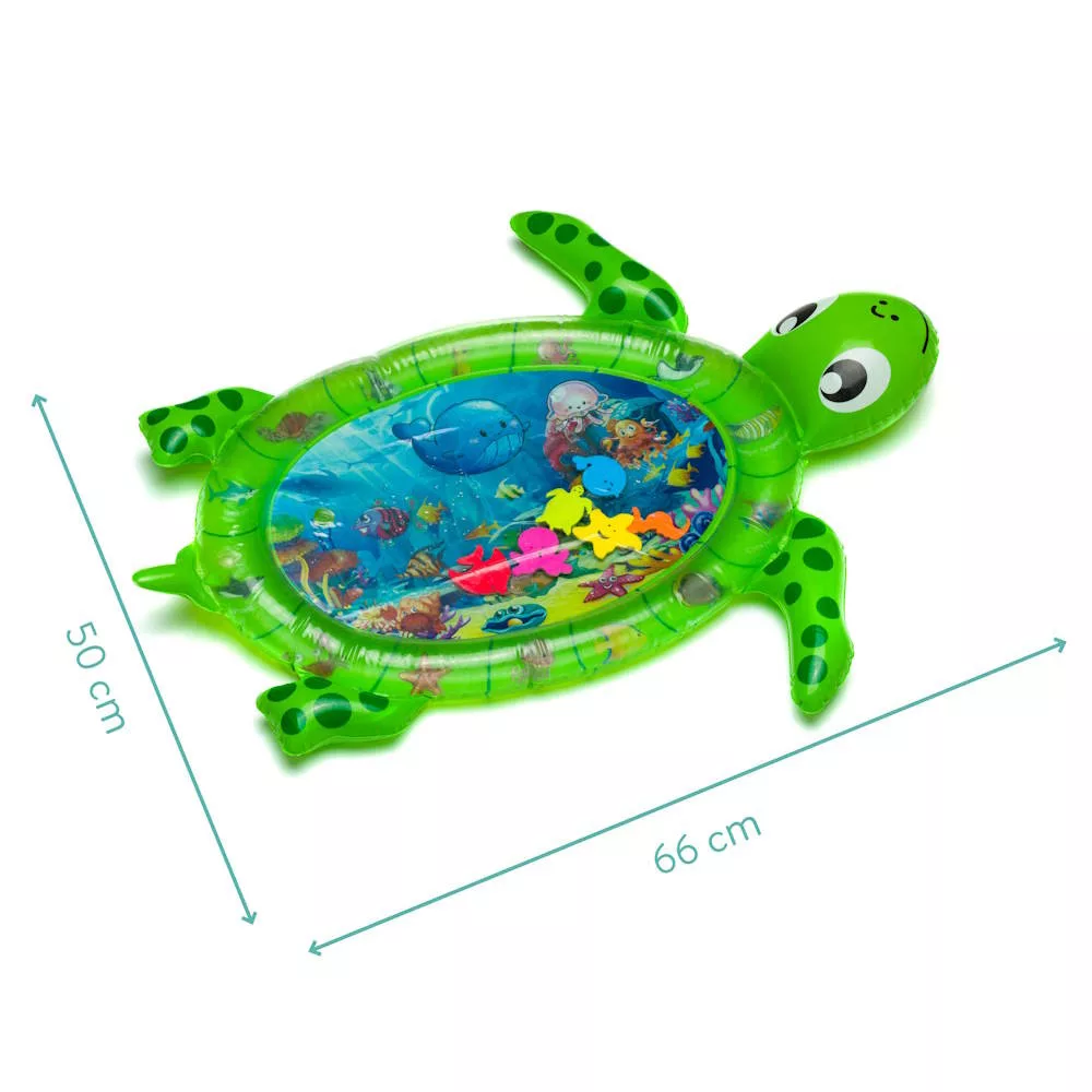 Merülj el a vízi szórakozásban a teknõs alakú vízi játékszõnyeggel – ideális játék a baba érzékszervi fejlõdésének és motorikus készségeinek játékos fejlesztésére. Ez a szeretettel megtervezett vízi játszómatrac nemcsak órákon át tartó szórakozást kínál, hanem különösen a 3 hónapos és annál idõsebb babák igényeinek megfelelõen lett kifejlesztve. Mérete: 66 x 50 cm, tökéletes a kis felfedezõk számára, és biztonságos, szórakoztató környezetet biztosít.A felfújható szegély extra kényelmet és biztonságot nyújt, így a baba nyugodtan fekhet és játszhat a matracon. A matrac belsejében színes vízi állatok úsznak, ösztönözve gyermekét arra, hogy elérje, nézze és megnyomja õket. Ezek a tevékenységek nemcsak a motorikus készségeket, hanem a szem-kéz koordinációt és a látási percepciót is fejlesztik. A vízi állatok különbözõ formái és színei szintén serkentik az érzékszervi fejlõdést, és lenyûgözõ élménnyé teszik a vízi játszómatrac használatát.A 100%-ban BPA-mentes anyagnak köszönhetõen biztos lehet benne, hogy a baba teljesen biztonságos környezetben játszik. A matrac könnyen megtölthetõ – töltsön vizet a belsõ részébe, fújja fel a külsõ szegélyt, és kezdõdhet is a szórakozás. Az erõs, de puha szövet biztosítja, hogy a matrac tartós és kényelmes legyen.A vízi játszómatrac nemcsak otthon, hanem útközben is remek játék – könnyen szállítható és egyszerûen felállítható, így bárhol szórakozást biztosít.Termék jellemzõk:- Méret: 66 x 50 cm- 3 hónapos kortól- Felfújható szegély- Segíti a fejlõdést- Anyag: 100% BPA-mentes- Tölthetõ vízzel