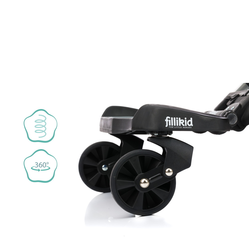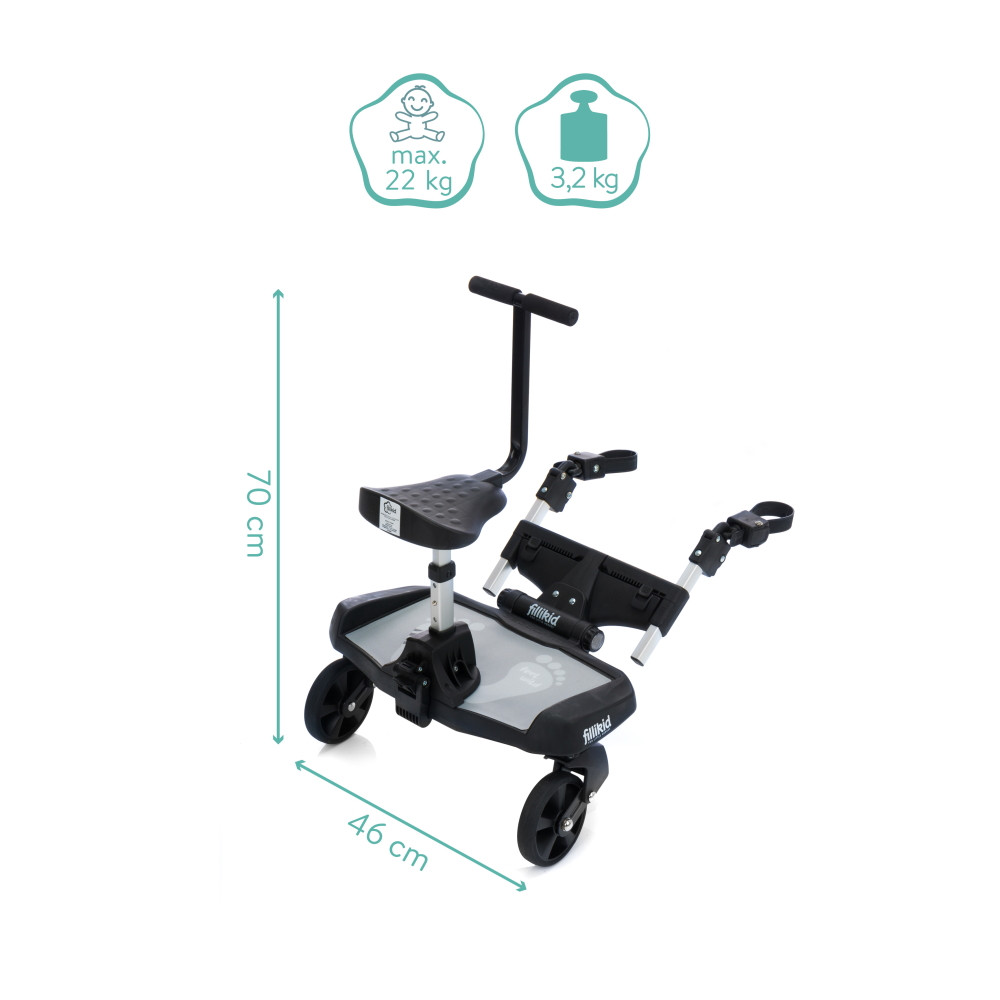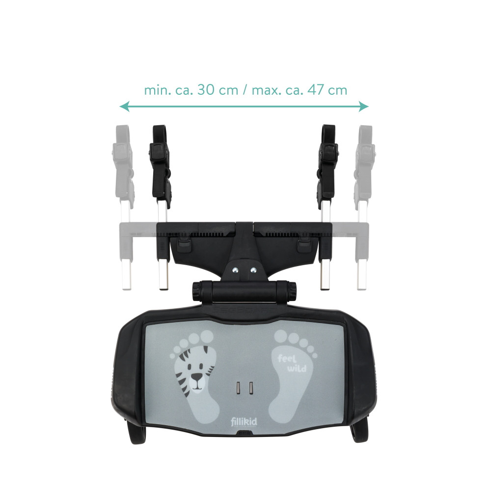 Filliboard Wide testvérfellépõ szettA nagyobb testvérek nagyon várják a kistestvér érkezését. Így nagyon is érthetõ, hogy minden sétának részesei akarnak lenni, és büszkén mutatják meg kistestvérüket mindenkinek.De ha a nagyobb gyermek kicsit elfárad az út során, és pihennie kell, a Filliboard Wide praktikus kiegészítõ üléssel az optimális megoldás. A Fillikid testvérfellépõ a 4 módon állítható csatlakozó rendszernek köszönhetõen univerzális: szélességében kb. 30-47 cm közt és hosszúságban 4 fokozatba állítható csatlakozókarok, 180°-ban elforgatható csuklók, vastagabb babakocsivázhoz is elegendõen hosszú pántok. Szinte minden babakocsihoz és sportbabakocsihoz illeszkedik. Könnyen és szerszám nélkül rögzíthetõ keresztirányú és függõleges vázrendszerre is. A Fillikid testvérfellépõ maximális teherbírása 22 kg. Ha a gyermeknek éppen nincs szüksége a testvérfellépõre, egyszerûen rögzítheti a babakocsi tolókarjához egy pánttal.Az ülõke levehetõ, a testvérfellépõ anélkül is használható. (Az ülõke önmagában nem használható, csak a testvérfellépõvel együtt.)Jellemzõk:- 2-tõl kb. 5 éves korig használható- Maximum 22 kg-ig terhelhetõ- Gyors és egyszerû felszerelés - Könnyen rögzíthetõ a tolókarhoz a mellékelt szállítópánttal- Két bolygókerékkel, kényelmes rugózással- Hosszúságban 4 fokozatba állítható csatlakozókarok- 180°-ban elforgatható csuklók- Vastagabb babakocsivázhoz is elegendõen hosszú pántok (max. 17 cm kerület)- A két csatlakozó kar közti távolság kb. 30- 47 cm közt változtatható– A testvérfellépõ szett tartalmazza a rászerelhetõ ülõkét is kis kapaszkodóval- Az ülés 3 különbözõ magasságba állítható- A termék súlya: 3,2 kg- A testvérfellépõ 46 cm széles és az ülõke kapaszkodója kb 70 cm magasságban van