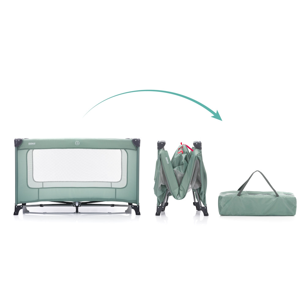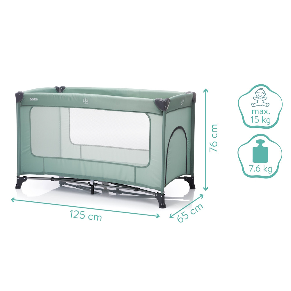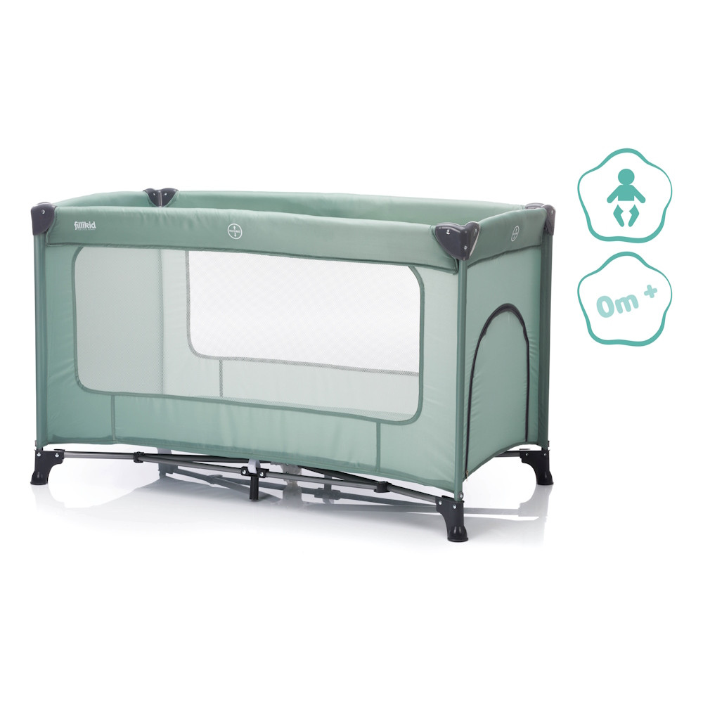 Fillikid Nizza utazóágyGyorsan kinyitható illetve gyorsan és könnyedén kisméretûre összecsukható utazóágy praktikus szállítótáskával- Újszülött kortól használható. - Az összecsukható babaágy maximum terhelhetõsége 15 kg.- Hálós falakkal, melyek nem engedik a babát elkószálni, de megfelelõ kilátást és szellõzést biztosítanak a számára- Az utazóágy rövidebb oldalán lévõ cipzárral nyíló kibúvón át a nagyobb gyerekek önállóan be- vagy kimászhatnak.- Méret (fekvõfelület): 120x60cm- Mérete nyitva: 125x65x76 cm- Huzat anyaga: 100% poliészterTartalma: utazóágy, merev aljú fekvõbetét, szállítótáskaOtthoni használatra vagy útközben. Ha szeretnéd, hogy gyermeked otthon érezze magát utazás közben vagy a nagyszülõknél is, a Fillikid Nizza utazóágyunk a megfelelõ választás. Könnyen és kompaktan összecsukható, a kiságyat a szállítótáskában magaddal viheted utazásaitokra. Az oldalsó része légáteresztõ hálós anyagból áll, amely nyugodt alvást garantál.