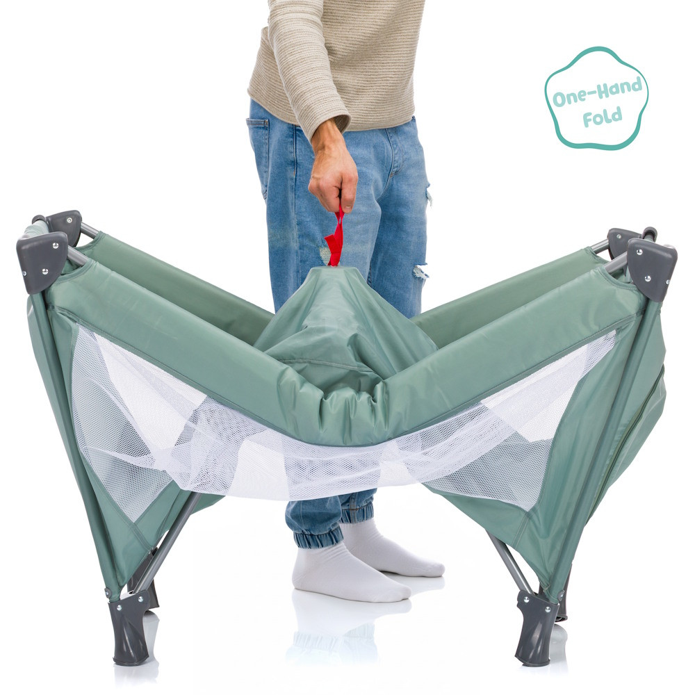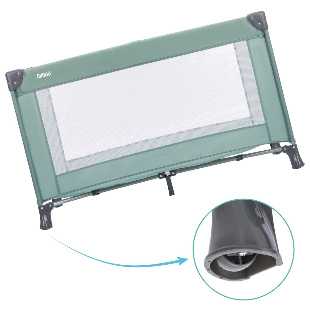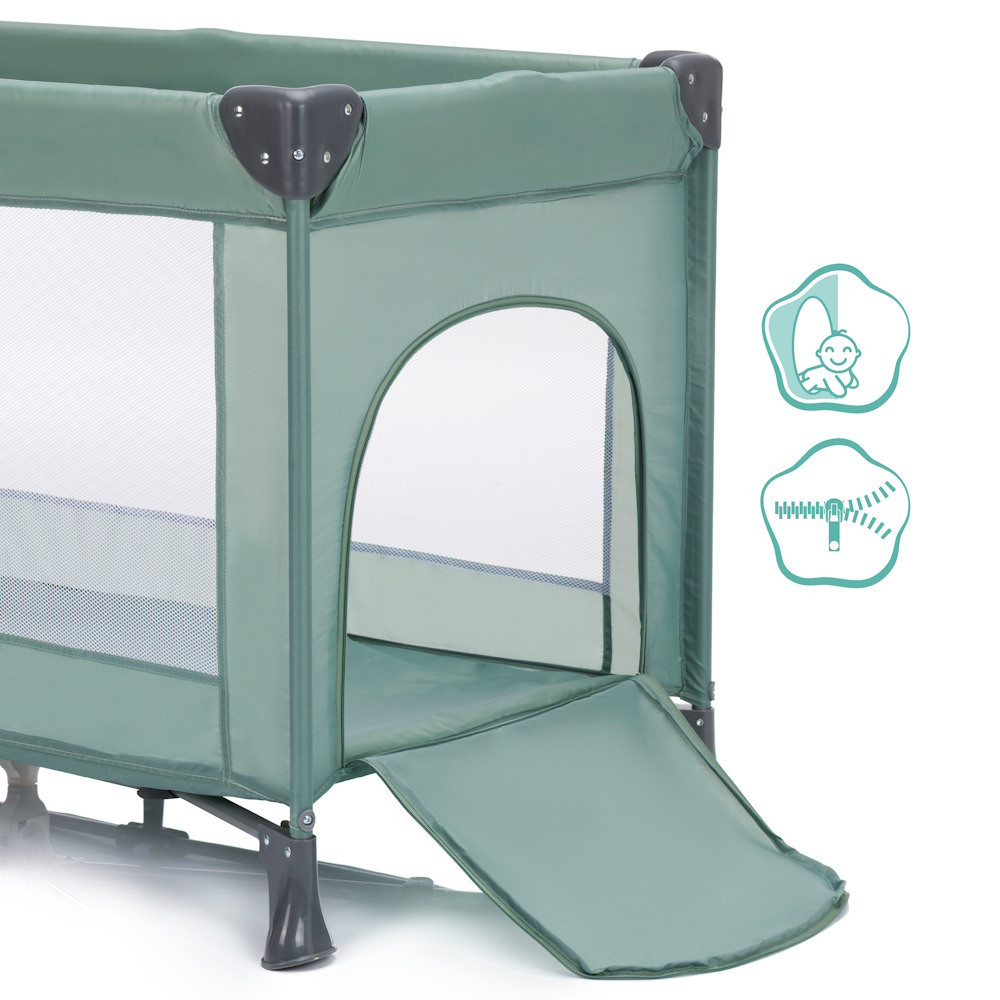 Akár családlátogatásra indulsz, utazol, vagy egyszerûen csak rugalmas alvási megoldásra van szükséged otthon, a Valencia utazóágy kényelmes és biztonságos helyet biztosít gyermeked számára.Az utazóágy nemcsak kompakt méretével és stílusos, puha zöld dizájnjával nyûgöz le, hanem mindenekelõtt átgondolt részleteivel, amelyek megkönnyítik a mindennapokat.Valódi különlegessége az innovatív egykezes összecsukó mechanizmus: ellentétben a hagyományos utazóágyakkal, amelyeknél több oldalon kell egyszerre nyomni és húzni, a Valencia egyetlen mozdulattal összecsukható – csak húzd meg a középen található fület, és az ágy könnyedén összecsukódik. Gyors, erõfeszítés nélküli, még akkor is, ha a babád a karodban van. Utazóágyat felállítani és összecsukni még sosem volt ilyen egyszerû!A beépített kerekeknek köszönhetõen könnyen mozgatható egyik szobából a másikba – megemelés nélkül.A cipzáras oldalsó bejárat különösen praktikus. Amint a gyermek elég nagy lesz, önállóan is ki- és be tud mászni. Így az ágy valódi kedvenc hellyé válik – nemcsak alváshoz, hanem játékhoz és pihenéshez is. A légáteresztõ hálós oldalfalak kellemes légáramlást biztosítanak, és lehetõvé teszik, hogy mindig szemmel tartsd a kicsit.Akár útközben utazóágyként, akár otthon második, rugalmas fekhelyként használod – a Valencia alkalmazkodik a családi élethez. Könnyû, jól átgondolt, magas minõségû kialakítás.Termékjellemzõk:• Méretek (H×SZ): 120 × 60 cm• Maximális terhelés: 15 kg• Ajánlott életkor: kb. 36 hónapos korig• Egykezes összecsukó mechanizmus• Kerekekkel – könnyen mozgatható, hátkímélõ• Oldalsó bejárat• Kompakt méret összecsukva