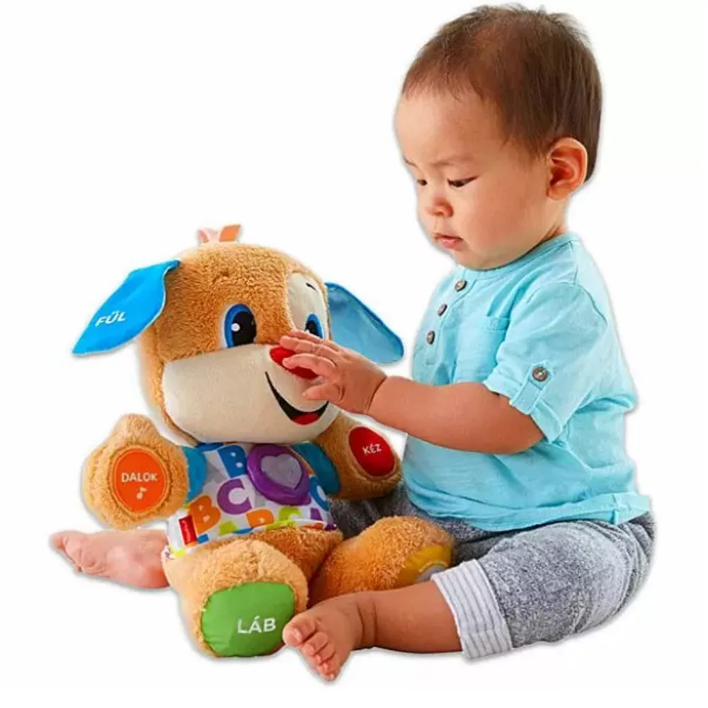 Fedezzétek fel együtt a világot a Fisher-Price Tanuló kutyussal! A Fisher-Price Tanuló kutyus világoskék fülû, piros orrú barátságos plüsskutya, aki azonnal a babák kedvence lesz! A kutya testrészeit megnyomva a játék megtanítja azok neveit, a színeket, az ABC-t és a formákat is. A kutyus igazodik a baba tudásszintjéhez, többféle szinten tud kommunikálni a babával. A Fisher-Price Tanuló kutyus 75 különféle hanggal, dallammal és kifejezéssel szórakoztatja a picit, a játék ölelgethetõ, puha töltéssel készült. A Fisher-Price Tanuló kutyus 3 db AA ceruzaelemmel mûködik, a csomagolás az elemeket tartalmazza. Méret: 27 cm.