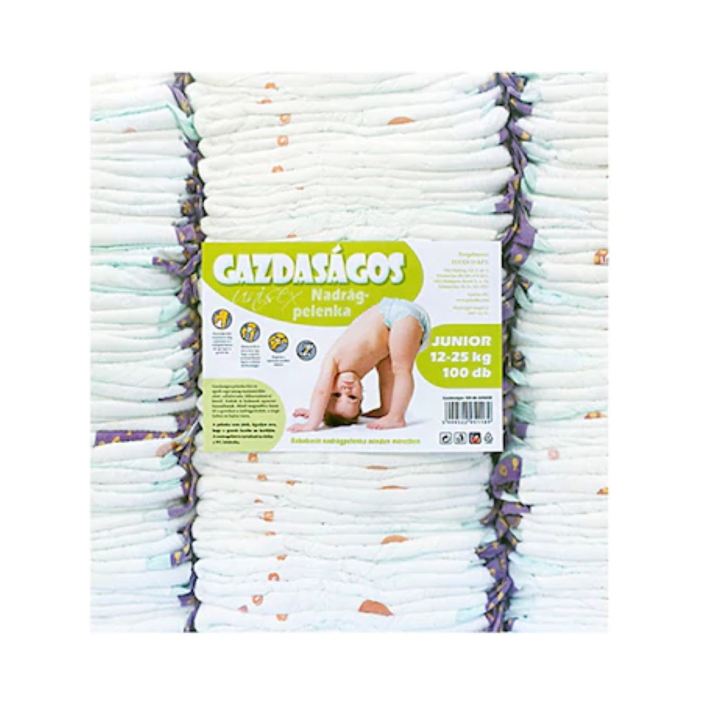 Jó minõségû, nagy kiszerelésû, tépõzáras nadrágpelenka, változatos, vidám mintákkal. A pelenkázás könnyû és gazdaságos, mivel az ára olcsó, megfizethetõ. Textiles borítású, légáteresztõs, tépõzáras, többször nyitható, zárható. Uniszex pelenka azaz kisfiúk és kislányok egyaránt hordhatják.A pelenkák mintája eltérhet a fotón szereplõ mintával!- Fontos! A termék egészségvédelmi és higiéniai terméknek minõsül. Amennyiben a csomagolás felbontásra került, vagy a kipróbálás jelei látszódnak a terméken, úgy a 14 napos elállási jog érvényét veszíti a 45/2014. (II. 26.) korm. rendelet 29. § (1) bekezdése alapján.