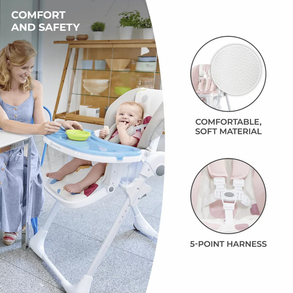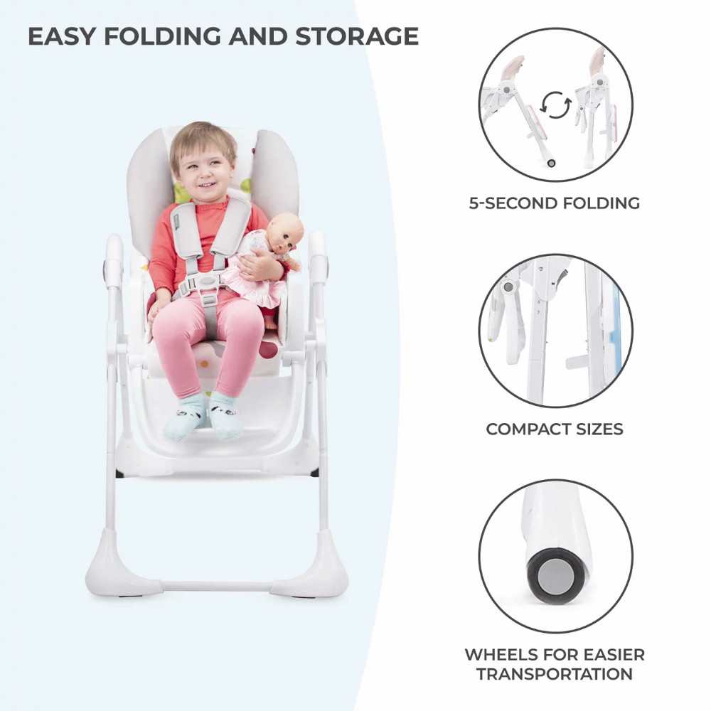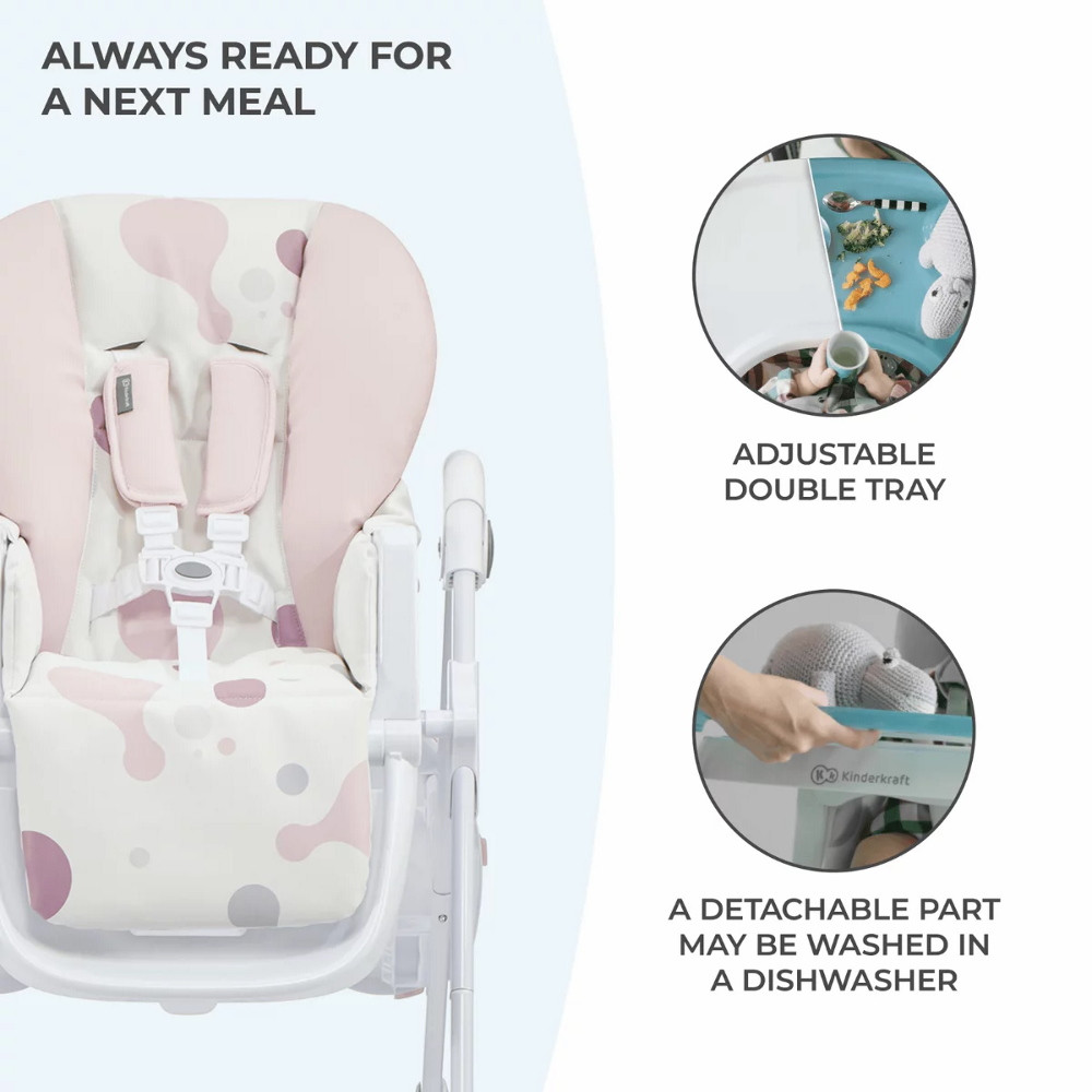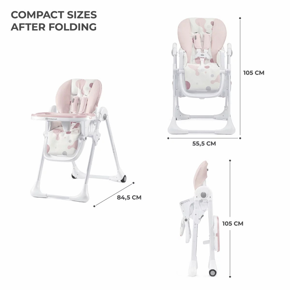 A mûbõrbõl készült puha burkolat biztosítja a kényelmet és könnyen tisztítható. 7 magassági fokozatba állítható az etetõszék, így könnyen beállítható a kívánt asztalmagassághoz. A háttámla 3 helyzetbe dönthetõ, így kisebb gyermekek számára is alkalmas.A dupla tálca három fokozatban állítható és könnyen tisztítható. Ez lehetõvé teszi, hogy könnyedén lerakhassa a gyermeket a székre, és beállítsa a tálca távolságát.5 pontos biztonsági öv, ami könnyen rögzíthetõ és mosáshoz kivehetõ. Az állítható lábtartó biztosítja a gyermek kényelmét. Összecsukva megáll magában.Mérete: 84,5 x 55,5 x 105 cmSúlya: 8,4 kg