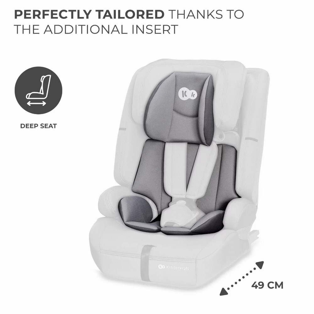 Kinderkraft gyerekülés Safety Fix i-Size 76-150cmAlkalmas 76-150 cm magas gyermekek számára (kb. 9 kg-tól kb. 12 éves korig)Telepítés:• 76-105 cm FWF (ISOFIX Top Tether belsõ heveder),• 100-150 cm FWF (ISOFIX autóöv) vagy (csak autó öv),• Csak elõre nézõ helyzetben használható• 5 pontos övrendszer vállpánt védõkkel (ütéscsillapító, csúszásgátló felület),• A termék az ECE R129 európai biztonsági elõírás szerint tesztelt és jóváhagyott,• Magas és masszív fejtámla, kényelmes állító fogantyúval (egykezes állítás),• Fejtámla extra puha memóriahabbal, hogy nagyobb kényelmet biztosítson gyermeke számára• 12 pozícióban állítható fejtámla reteszelõ mechanizmussal,• A háttámla dõlésszöge az autóülés dõlésszögének megfelelõen állítható,• Puha, kényelmes betét a legkisebb gyermekek számára,• További 2 puha belsõ párna (1. rész: ülés/támla, 2. rész: fejtámla párna),• Mûanyag övvezetõk a fejtámlán és textil övvezetõk az ülésen, átlátszó zöld autós övvezetõ-jelzõk, könnyû hozzáféréssel a csathoz,• Beszereléskor használható csatos tároló 100-150 cm, (ISOFIX autó öv) vagy (csak autó öv),• Levehetõ, mosható szövethuzat.Magasság:60.5-82.5 cmSzélesség:44 cmMélység:49 cm
