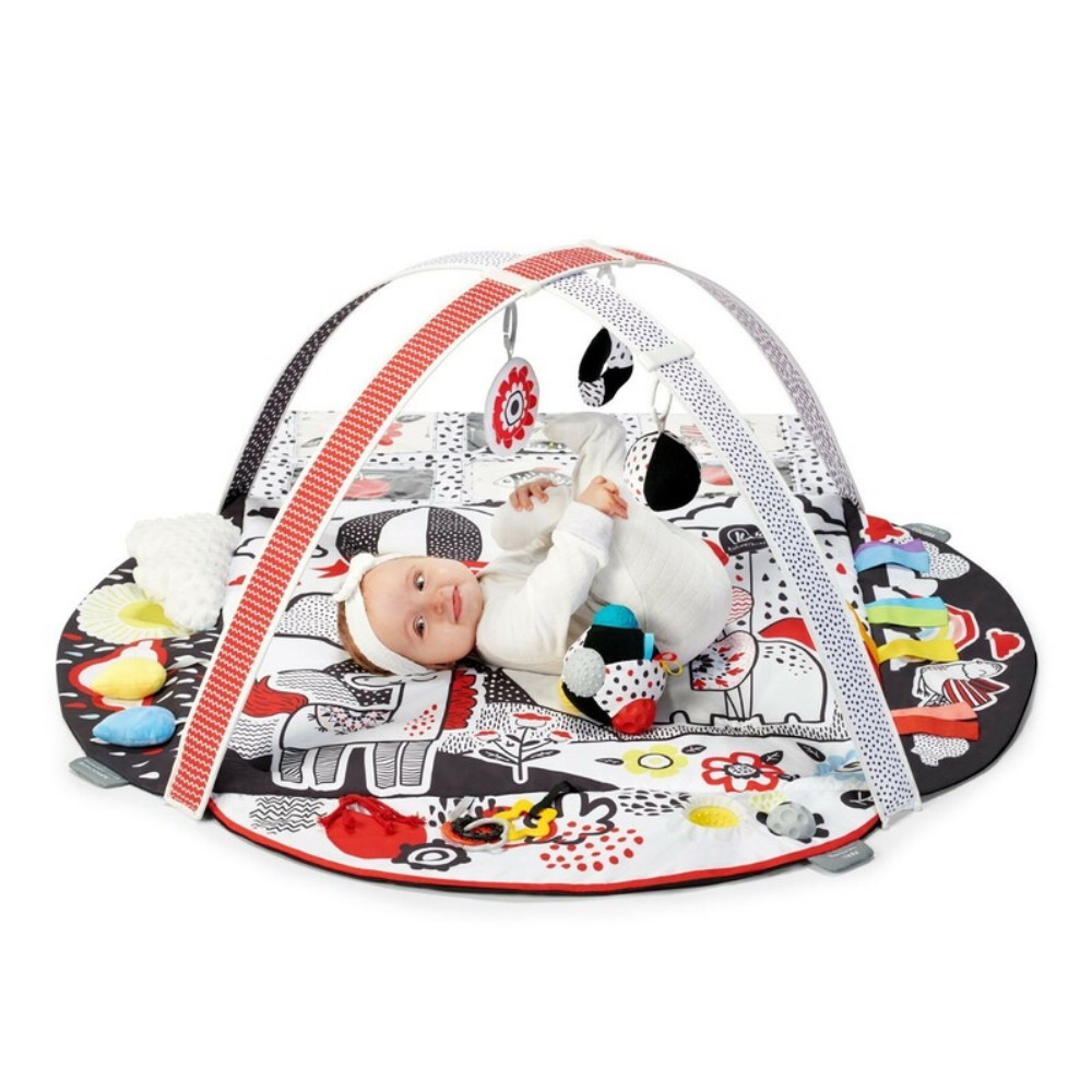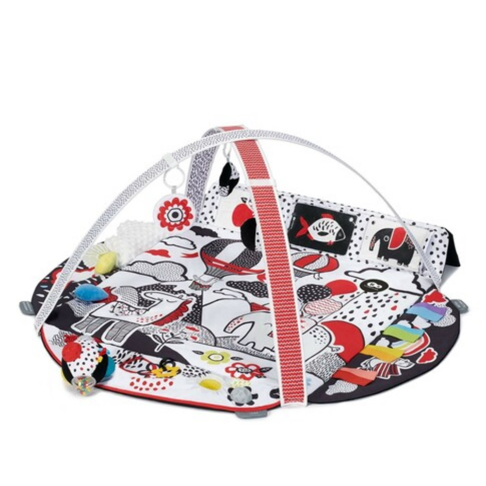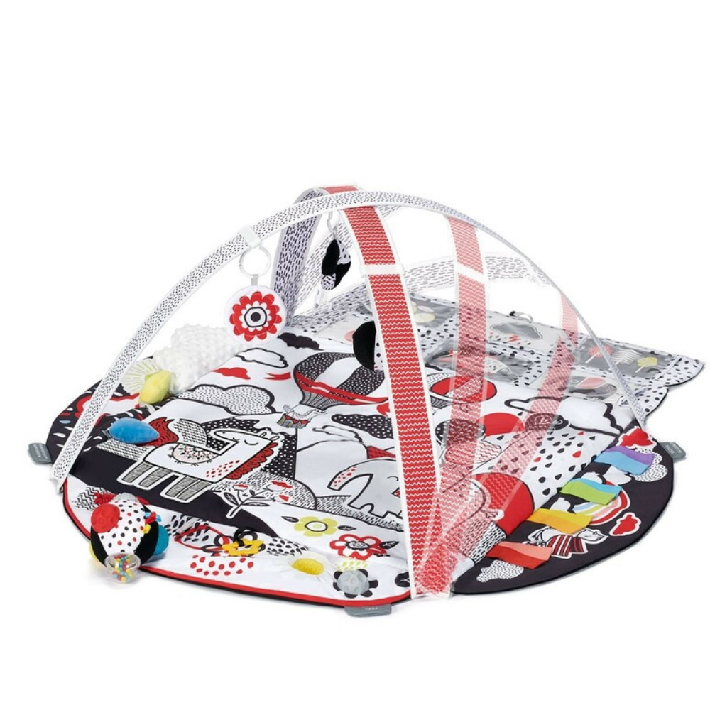 Az élet elsõ hónapjaiban a gyerekek csak kontrasztos, tiszta színeket érzékelnek. Ez egy csodálatos fejlesztõszõnyeg - négy zónára oszlik, amelyek fejlesztik gyermek látását, hallását, érintését és koncentrációját már születésétõl fogva. A 4SMART arra ösztönzi a kicsi embert, hogy érintse meg, nyújtsa kezét, mozogjon és játsszon. A szõnyeg puha és biztonságos.A színes szalagok és a gondosan kiválasztott színek lehetõvé teszik, hogy a kicsi gyakorolja a látást. A 4SMART szenzoros szõnyeg érdekes textúrákkal rendelkezik. A 4SMART rendelkezik egy zónával, amely lehetõvé teszi gyermekének, hogy megismerje a különbözõ hangokat. Ez annak a kontrasztos játéknak köszönhetõ, amely megérintéskor susog, hangot ad és zörög. A kicsi megtanulja az ok-okozati összefüggést.A szettben található kártyákat egy speciális mûanyag zsebbe lehet tenni a szõnyeg oldalán. Különbözõ formákat mutatnak és kontrasztosak. A szõnyeg oldala felemelhetõ, hogy arra ösztönözze kisgyermekét, hogy emelje fel a fejét és edzze a nyakizmait.A készlet tartalmaz egy fejlesztõlabdát nagy, sokszínû, érdekes gombokkal és mintákkal. A 4SMART 12 darab kétoldalas fekete-fehér kártyával és egy babatükörrel érkezik, amelyeket sétákra magával vihet a baba, például a babakocsira erõsítve.Méret: 128 x 116 cmFelhajtott szélekkel: 75 x 75 cmLehajtott szélekkel: 126 x 112 cm