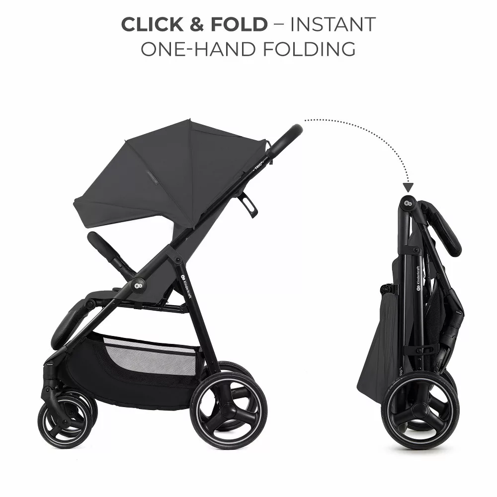 Kinderkraft TRIG 3 sportbabakocsiEgy babakocsi 25 kg-ig - CLICK & FOLD – egy kézzel összecsukható - Defekttûrõ kerekek - Nagy, állítható puha ülés - Könnyû felépítmény (8,9 kg.) - Könnyû manõverezés - Vízálló és nagy árnyékot adó kupola - Megerõsített acélváz, mely 25 kg összsúlyig terhelhetõ, vagyis 22 kg gyermek ülhet benne és 3 kg súly helyezhetõ a kosárba. - kosár - Fekvõ helyzetig állítható lábtámasz (összesen 3 pozíció) - Fekvõ helyzetig állítható háttámla - 5 pontos biztonsági öv - 360 fokban forgó elsõ kerekek, melyek fixálhatókA TRIG 3 babakocsi nem csak mindennapi használatra, hanem kirándulásokra is tökéletes. Könnyen szállítható, könnyû kormányozni, és rendkívül könnyen manõverezhetõ, így ideális zsúfolt helyekre is. A TRIG 3 minden idõjárási viszonyok között remekül használható – a kupola vízálló anyagból készült, és hátul egy kiegészítõ szellõzõpanel található a forró napokra.A TRIG 3 babakocsi tökéletes minden szülõi kihíváshoz. Nagyméretû, defektálló kerekekkel rendelkezik, amelyek ideálisak a városban és azon kívül egyaránt. A lengéscsillapítók még egyenetlen terepen is kényelmet biztosítanak gyermeke számára, a 360°-ban elforgatható elsõ kerekek pedig reteszelhetõek, így a kormányzás szinte gyerekjáték.