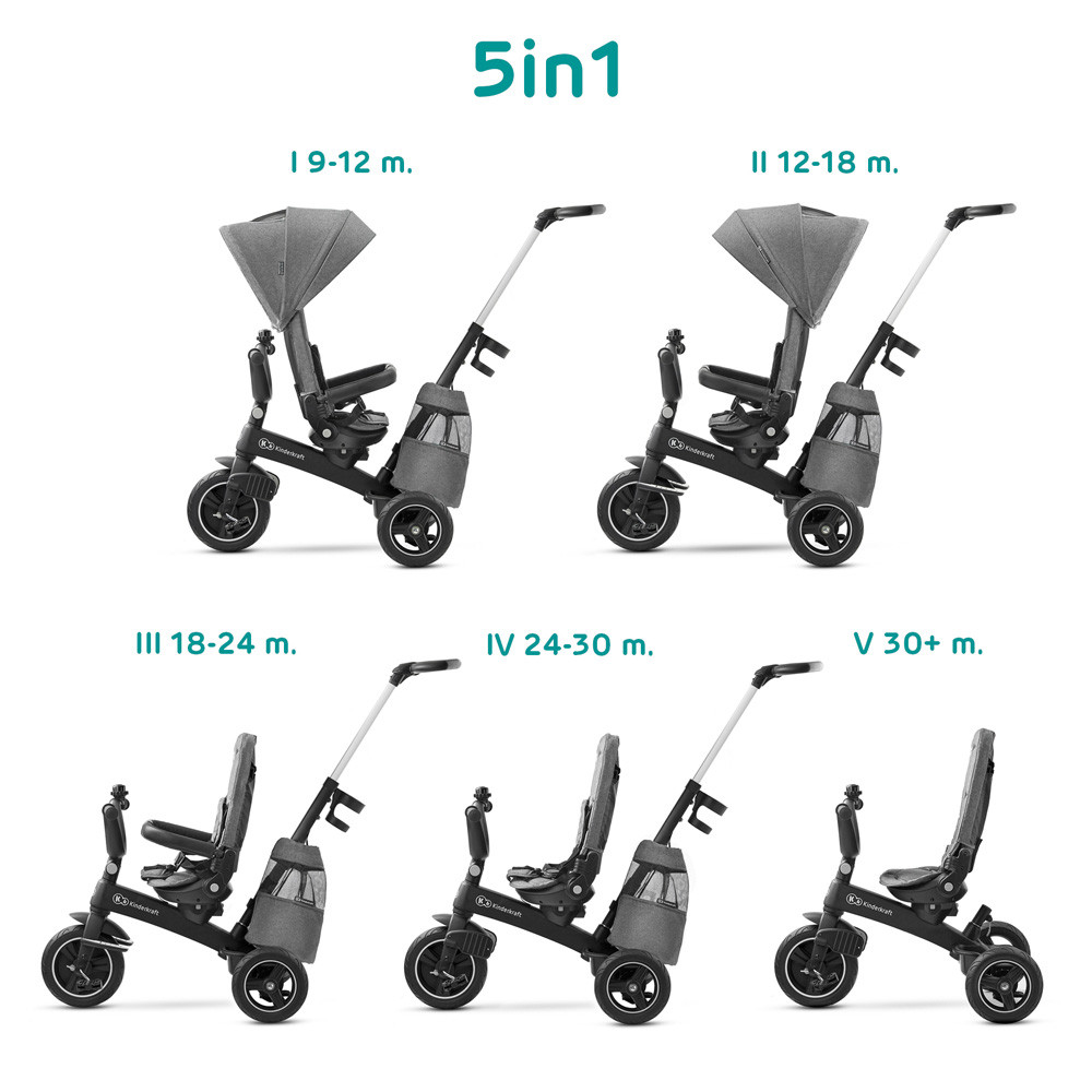Különleges felépítése azt biztosítja, hogy a kisgyermek növekvõ igényeivel együtt változik, fejleszti az egyensúlyt, a kicsi pedálozási képességeit és motoros koordinációt minden kaland során.A könnyû magnéziumötvözetû váz segít a kicsinek az egyensúly megtartásában és a tricikli irányításában. Tartós, így hosszú ideig szolgálja a kisgyermeket. A jobb esztétika és tartósság érdekében a teljes szerkezet egy öntvénybõl készül. A váz ellenáll a korróziónak és elnyeli a rezgéseket.CLICK & TWIST 360°-os forgatható ülés segítségével a kicsi nézhet a szülõvel szemben és annak háttal is egy gomb megnyomásával.Az állítható háttámla kényelmes ülõ- és fekvõ helyzetet biztosít, ami ideális, ha a kicsi szundítani szeretne.Állítható motorháztetõ minden idõjáráshozFüggetlenül attól, hogy intenzív napsütésben, szélben vagy esõben sétálunk-e, az UPF 50 szövetbõl készült széles, állítható, vízálló kupola védi kisgyermeket.Ez a kerékpár a gyermekkel együtt növekszik, alkalmazkodva az õ igényeihez. Ez azt jelenti, hogy hosszú ideig kíséri gyermekét.Garantálja a kényelmet a széles ülésnek és a kényelmes háttámlának köszönhetõen, amik stabil támaszt és jó testtartást biztosítanak.Állítható ötpontos biztonsági öv puha párnákkal megvédi a kicsit a használat közben. Az öv három magasságba állítható a kicsi méretének megfelelõen.A kisgyermeket ezenkívül egy puha kapaszkodó is védi, ami a késõbbiekben könnyen levehetõ.A tricikli poliuretán kerekei erõsek, tartósak, defekt- és kopásállóak. Ezen túlmenõen a hátsó kerekek csapágyasak, így minden felületen használhatóak.A levehetõ szülõtolókar magassága könnyen beállítható 81-102 cm között négy magasságba.Összecsukható lábtámasz, mosható huzatok és nagy bevásárlórész még tökéletesebbé teszi a használatot.9 hónapos kortól kb. 5 éves korig ajánlott.Súly: 10 kg