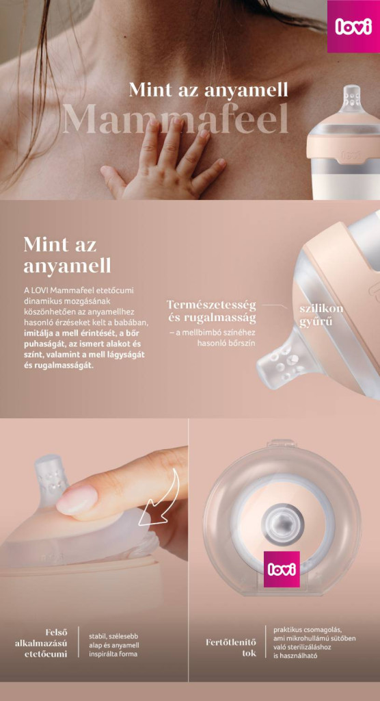 Innovatív Mammafeel cumisüveg az anyai mellet mintázza - forma, tapintás és a mozgás tekintetében. A cumisüveg kialakításának köszönhetően a cumisüveges táplálás kombinálható a szoptatással.