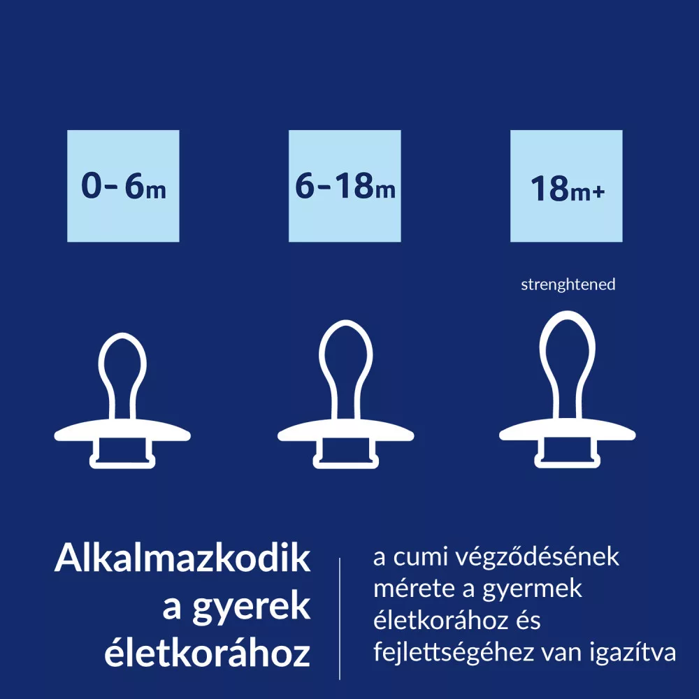 A cumikat minden használat előtt alaposan ellenőrizni kell. Minden irányban meg kell húzni. Az első károsodás vagy anyaggyengülés jeleinél a terméket ki kell dobni. Csak speciális szalagot vagy láncot szabad használni, amelyeket az EN 12586 szerint teszteltek. Más szalagok vagy zsinórok használata fulladást okozhat. A cumit ne tegye ki közvetlen napfénynek vagy hőforrás közelébe. A sterilizáló oldatban való tartás ideje ne haladja meg az ajánlott időt, mert az károsíthatja a cumit. A használati útmutatót meg kell őrizni, mert fontos információkat tartalmaz. A tételkód a csomagoláson található.