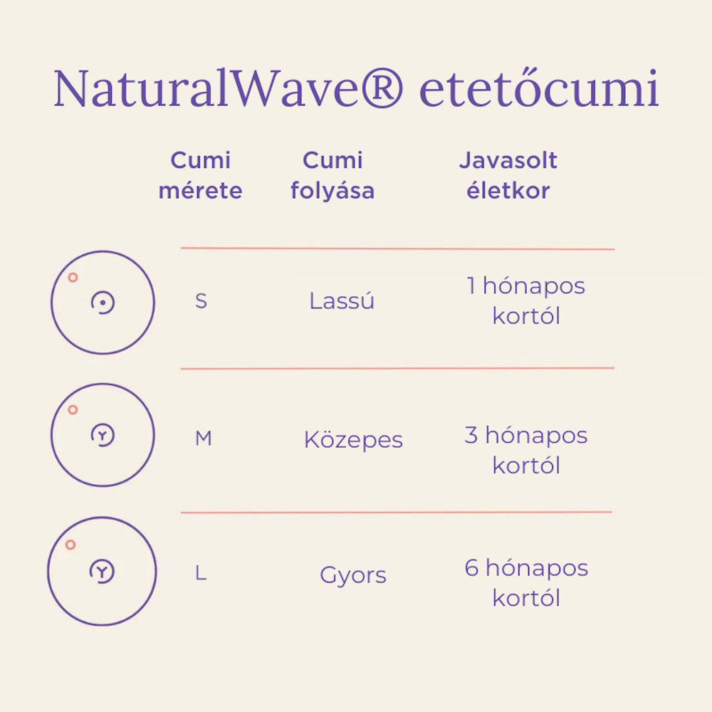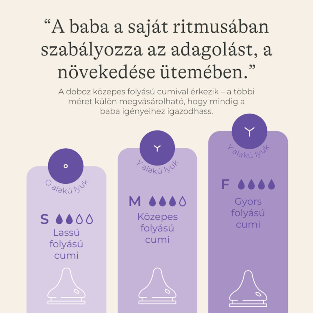 Puha, rugalmas szilikon: támogatja a baba megszokott szopó mozgását és nyelvét természetes hullámvonalú mozgásra ösztönzi.