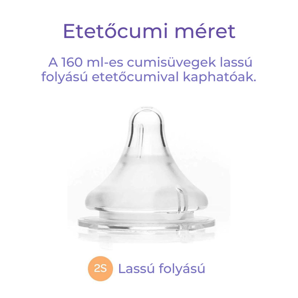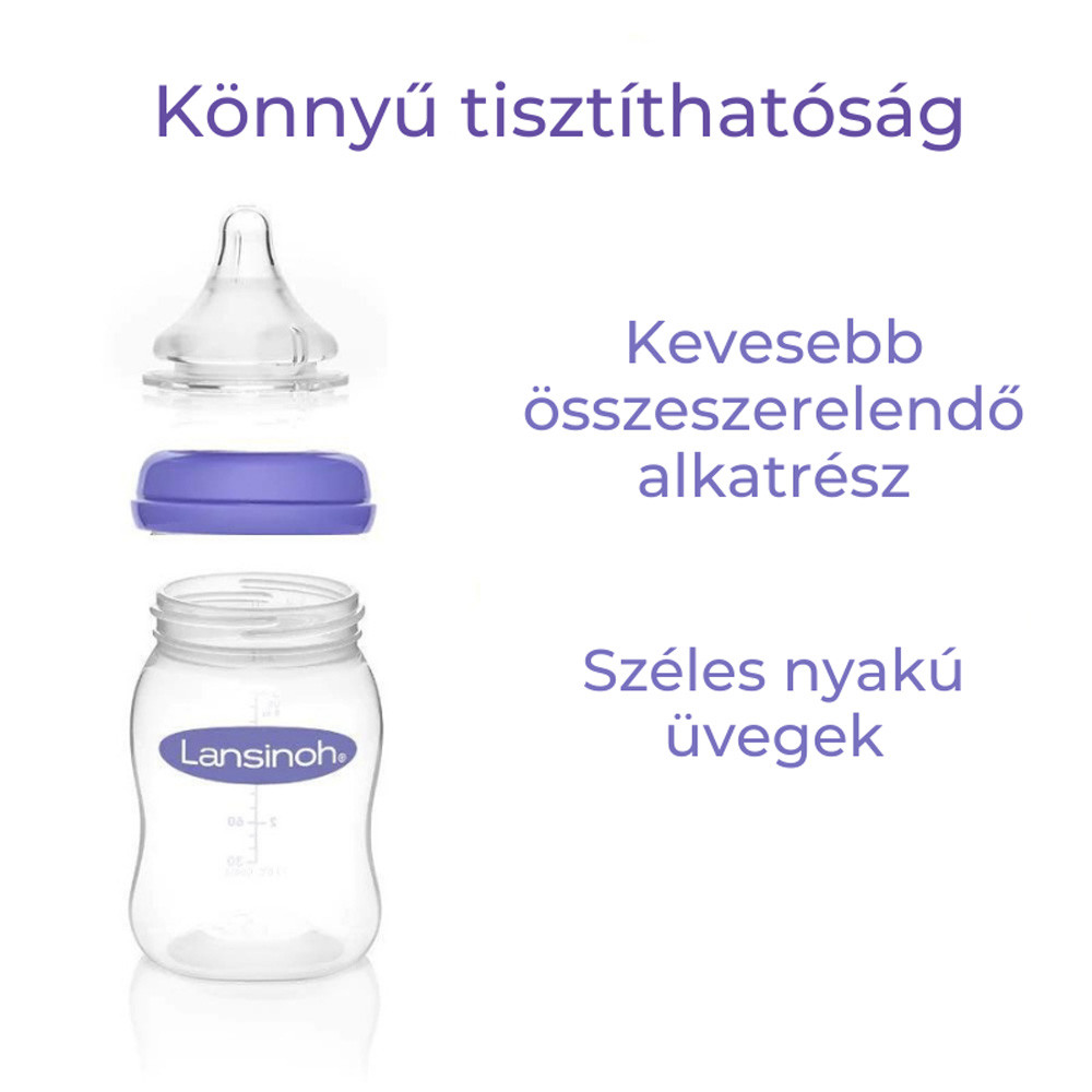 Üveg cumisüveg, lassú folyáserõsségû, természetes hullámvonalú etetõcumival. Speciális boroszilikát üvegbõl készült, hõálló és ellenáll a hõsokknak. Könnyen tisztítható és sterilzálható. 100%-ban környezetbarát és újrahasznosítható. Kifejezetten szoptatott babáknak is fejlesztették. Könnyû váltást biztosít a szoptatásról a cumisüvegre és vissza. Az etetõcumi a baba nyelvét hullámszerû mozgásra ösztönzi a száj és állkapocs természetes fejlõdéséért. Csak a baba szívására ürül. Segít fenntartani a bevált szopási módotTulajdonságok:– Csak a baba szívására nyílik meg, ezért a fogorvosok kiemelten ajánlják.– Egybeöntött, különbözõ vastagságú és textúrált, hasonló, mint a mellbimbó és a bimbóudvar.– Extra puha, 100% szilikonból készült.– Formája az anyamellet utánozza, rugalmas, nyújtható anyagú, hosszú élettartamú.– Egyedülálló, fokozatosan ívelt kialakítása lehetõvé teszi a természeteshez közeli szopási folyamatot.– Dupla peremmel fekszik fel az üveg nyakára, ezért 100%-ban cseppmentes.– A levegõáramlást biztosító speciális szelepe miatt kevesebb a lenyelt levegõ, a hasfájás és ritkább a bukás.– A cumi csúcsában lévõ megerõsítések megakadályozzák az összetapadását.Mielõtt cumisüvegbõl etetnétek a picit lehetõleg várjátok meg, hogy begyakorolja melleden a szopási technikát.Mindig szoptatás elõzze meg a hozzátáplálást!A babák szopási folyamata:1. Ajkait kifelé fordítva rátapad a bimbóra és bimbóudvarra.2. Nyelve hullámszerû mozgással összenyomja a bimbót és a szájüregében lévõ vákuummal kiüríti a tejet.3. Nyelvének hátsó része megemelkedik és a tejet a nyelõcsõbe vezeti, lenyeli.A Lansinoh etetõcumi támogatja ezt a természetes szopási folyamatot!A kizárólagos szoptatás ajánlott a babák életének elsõ 6 hónapjában!- Fontos! A termék egészségvédelmi és higiéniai terméknek minõsül. Amennyiben a csomagolás felbontásra került, vagy a kipróbálás jelei látszódnak a terméken, úgy a 14 napos elállási jog érvényét veszíti a 45/2014. (II. 26.) korm. rendelet 29. § (1) bekezdése alapján.