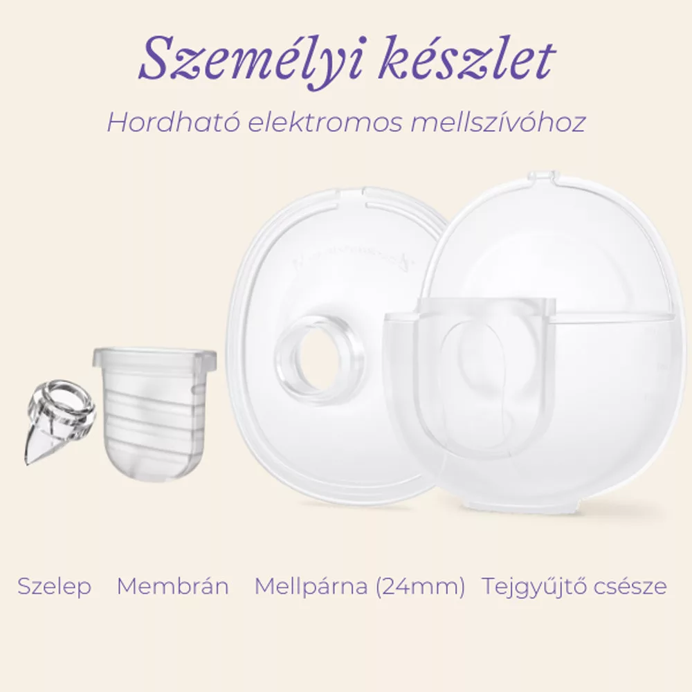 A személyi készlet minden alkatrészt tartalmaz, ami az anyatejjel érintkezik:Tejgyûjtõ csésze szilikon mellpárna (24mm) membrán szelep.Kompatibilis az alábbi mellszívókkal:- Lansinoh hordható mellszívó 4 fázisú – egyes- Lansinoh hordható mellszívó 4 fázisú – dupla- Fontos! A termék egészségvédelmi és higiéniai terméknek minõsül. Amennyiben a csomagolás felbontásra került, vagy a kipróbálás jelei látszódnak a terméken, úgy a 14 napos elállási jog érvényét veszíti a 45/2014. (II. 26.) korm. rendelet 29. § (1) bekezdése alapján.