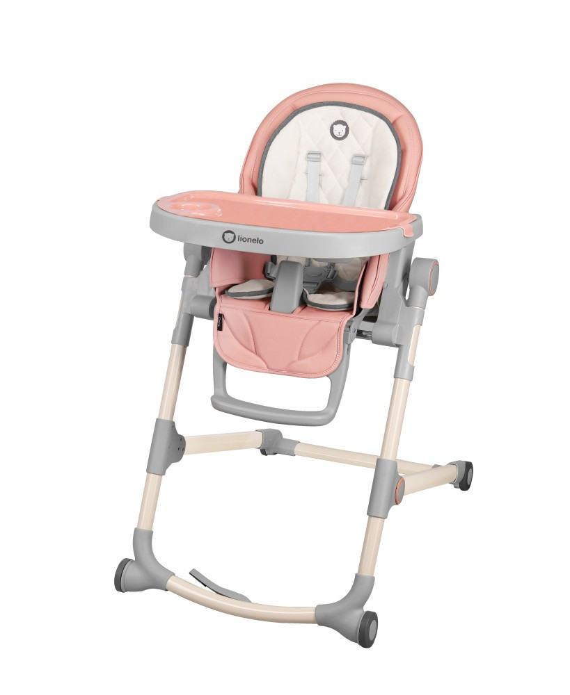 Az etetőszék egy nagy aerodinamikus tálcával, levehető szilikon betéttel, valamint puha ECO bőr kárpittal rendelkezik. A szűkítőbetét (75% pamut és 25% poliészter) puha és kényelmes, remekül alkalmazkodik a kisebb gyermekek méreteihez. Az etetőszék háttámlája mögött egy praktikus zsebkendőtartó található.