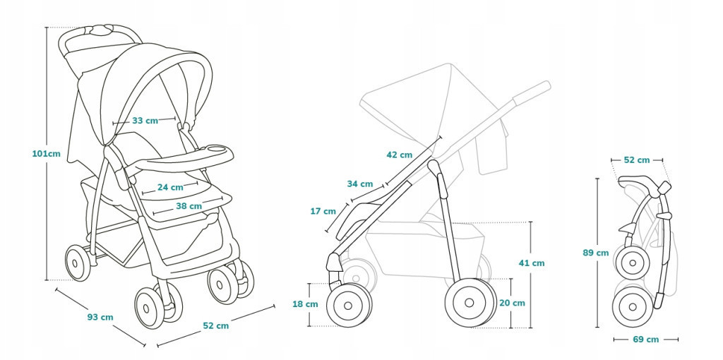 - Az összecsukott babakocsi méretei: 89 x 69 x 52 cm