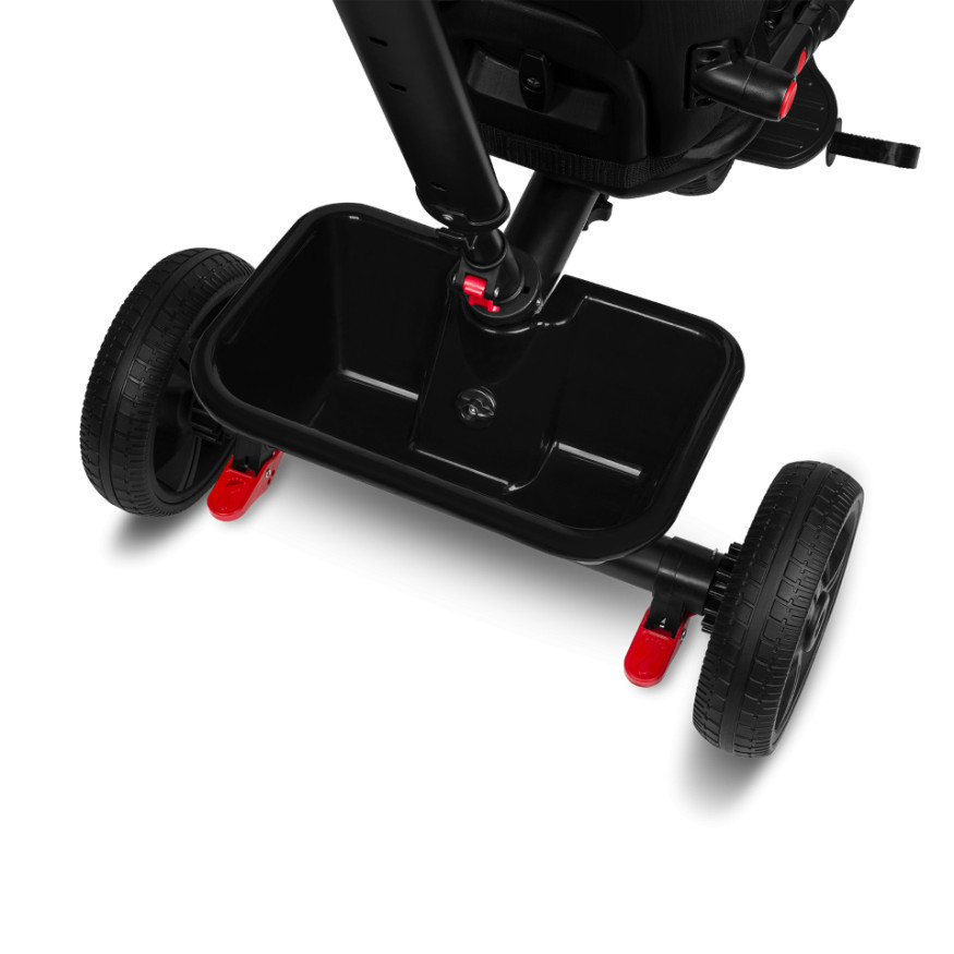 A tricikli biztonságát 3 pontos párnázott biztonságiöv biztosítja minőségi habszivaccsal. A termék csúszásgátló párnákkal van felszerelve a kormányon és fluoreszkáló elemekkel a napernyőn, aminek köszönhetően a tricikli jobban látható. A termékhez 2 db fék is tartozik a hátsó tengelyen.