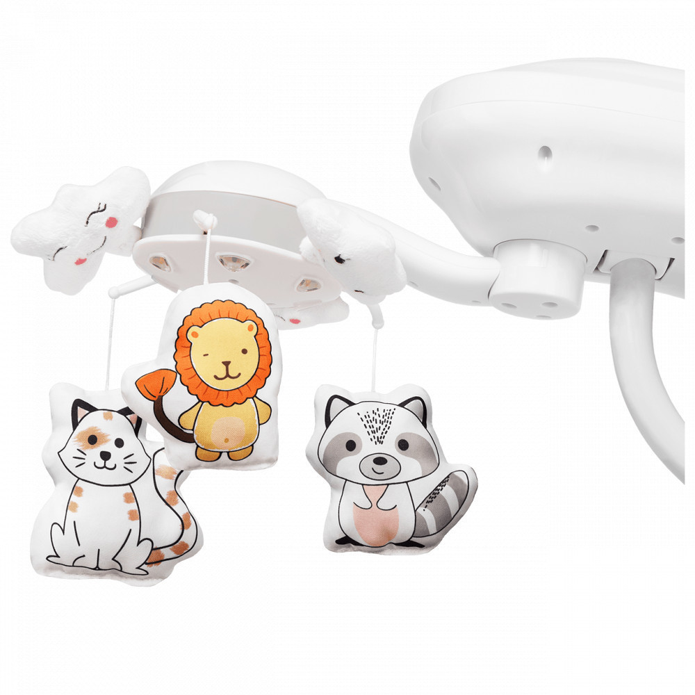 A Henny 2in1 hinta és pihenőszék forgatható állvánnyal, plüssjátékokkal és 7 színben fényt kibocsátó projektorral van felszerelve. A termék 12 előre feltöltött dallamot és természethangot is tartalmaz, amelyek nyugtatóan hatnak a kisbabádra. Lehetővé teszi, hogy MP3 formátumban hallgathassatok dalokat az USB-csatlakozóval ellátott lejátszónak köszönhetően. Ezenkívül könnyen tisztítható anyagból készült kárpitja van.