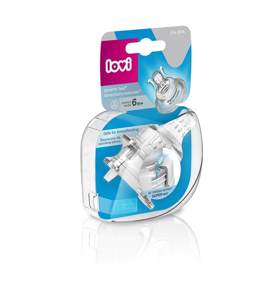 A Lovi dinamikus Super Vent cumi a lefejt anyatejre lett kifejlesztve az orvosok - neurologopédusok által. Heterogén szilikonrétegből készült, amely az etetés során változtatja az alakját és alkalmazkodik a gyermek szívó erejéhez és ritmusához. Ezért nem sérti meg a szopóreflexet és a szoptatás és a cumisüvegből való etetés kombinálását.